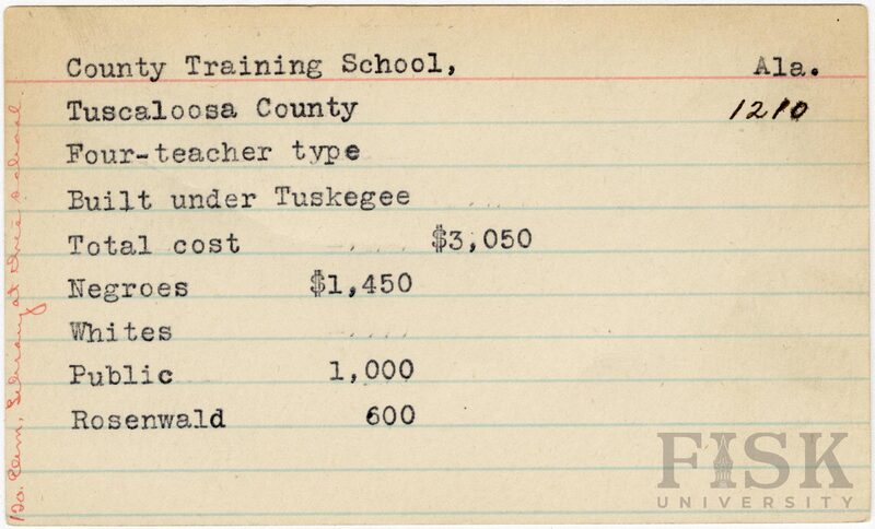 - School card from Rosenwald Fund for County Training School in Tuscaloosa County, Alabama with a handwritten note on the far left of the card that says, "120 elem. Library at this school."