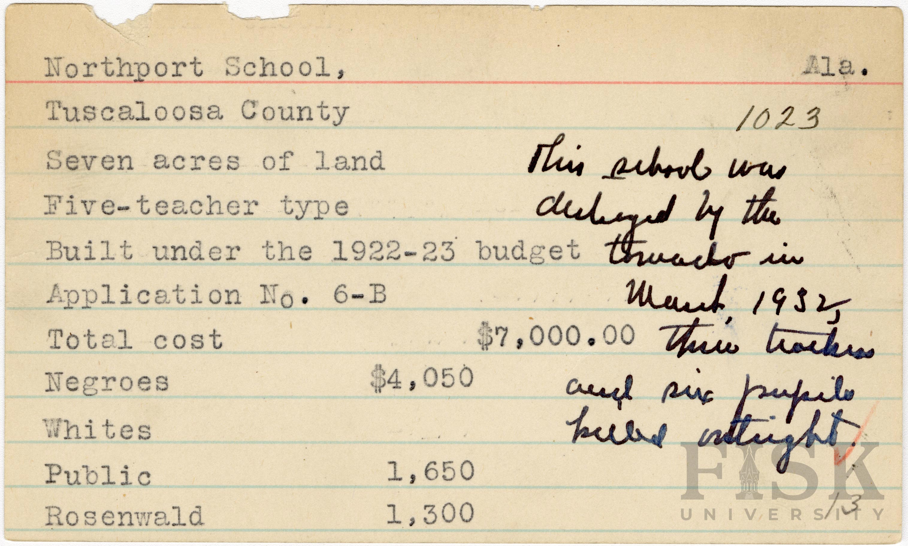 School card from Rosenwald Fund for Northport School in Tuscaloosa County, Alabama with a handwritten note that says, "This school was destroyed by the tornado in March 1932. Three teachers and six pupils…"