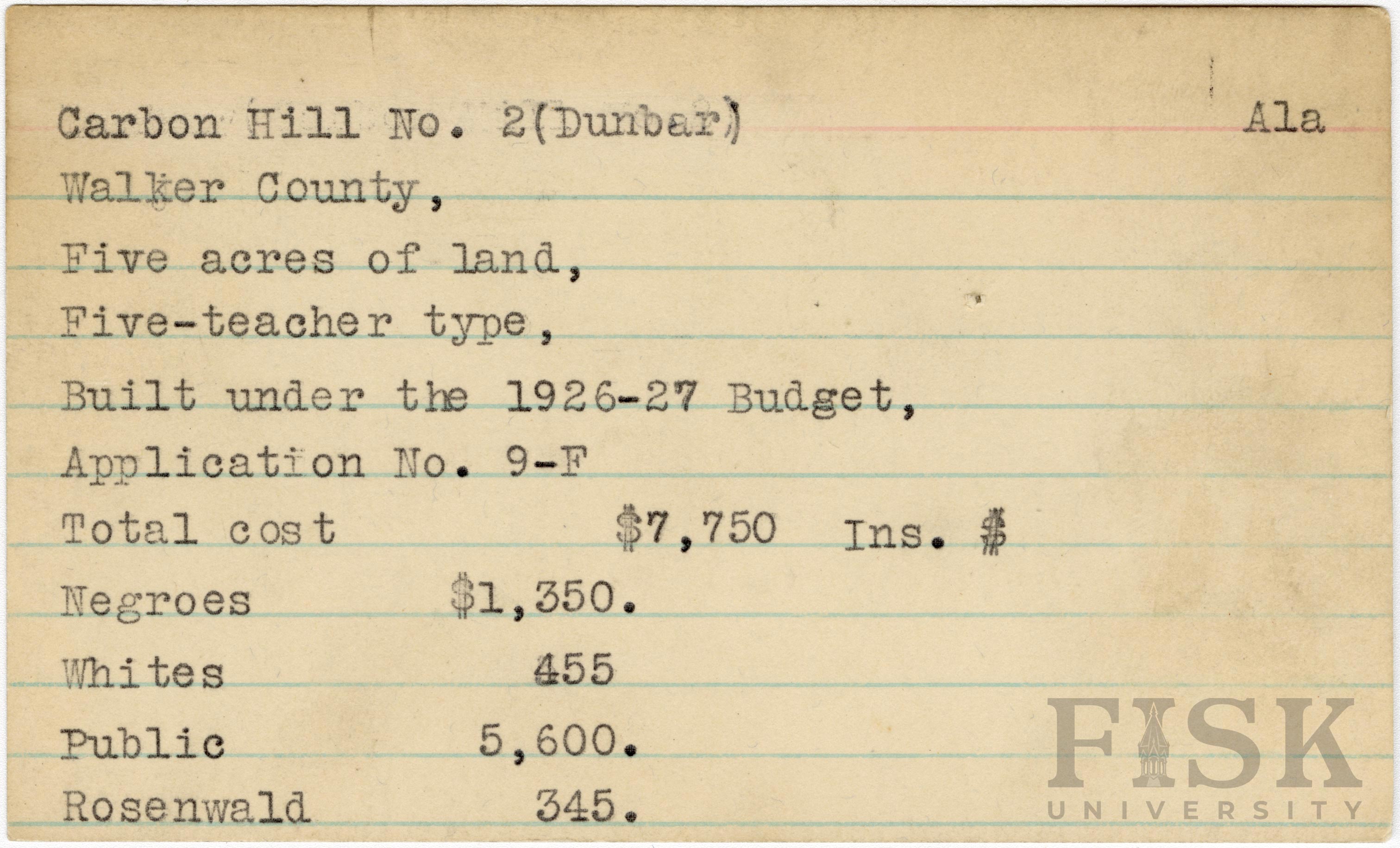 - School card from Rosenwald Fund for Carbon Hill School No. 2 in Walker County, Alabama