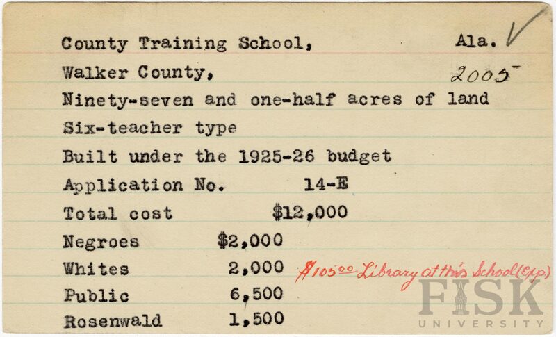 School card from Rosenwald Fund for County Training School in Walker County, Alabama with a handwritten note that says, "$105.00 library at this school (Exp)"