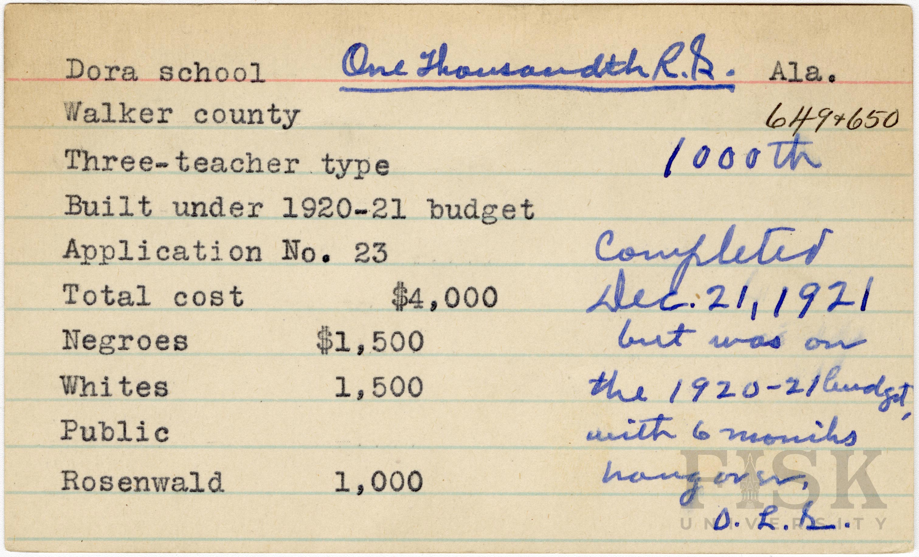 School card from Rosenwald Fund for Dora School in Walker County, Alabama with handwritten notes that say, "One Thousandth R.S.", "1000th", and "Completed December 21, 1921 but was on the 1920-21 budget with 6 months hangover"