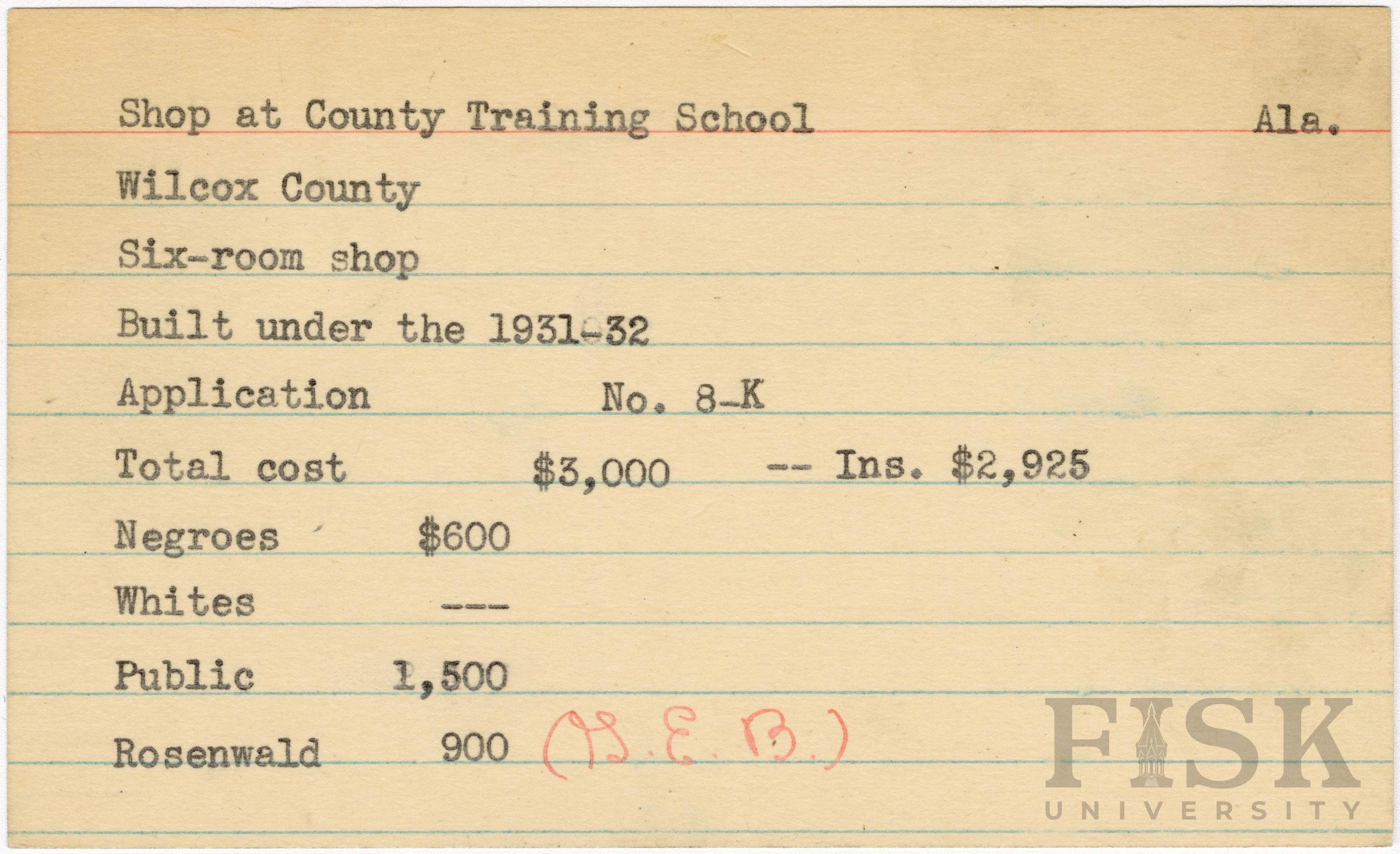 School card from Rosenwald Fund for the six-room shop at County Training School in Wilcox County, Alabama with a section added to the budget contributions that says, "Ins. $2,925" and "(G.E.B.)" handwritten next to the Rosenwald section of the budget contributions.