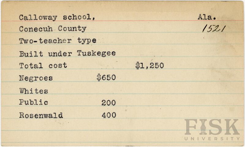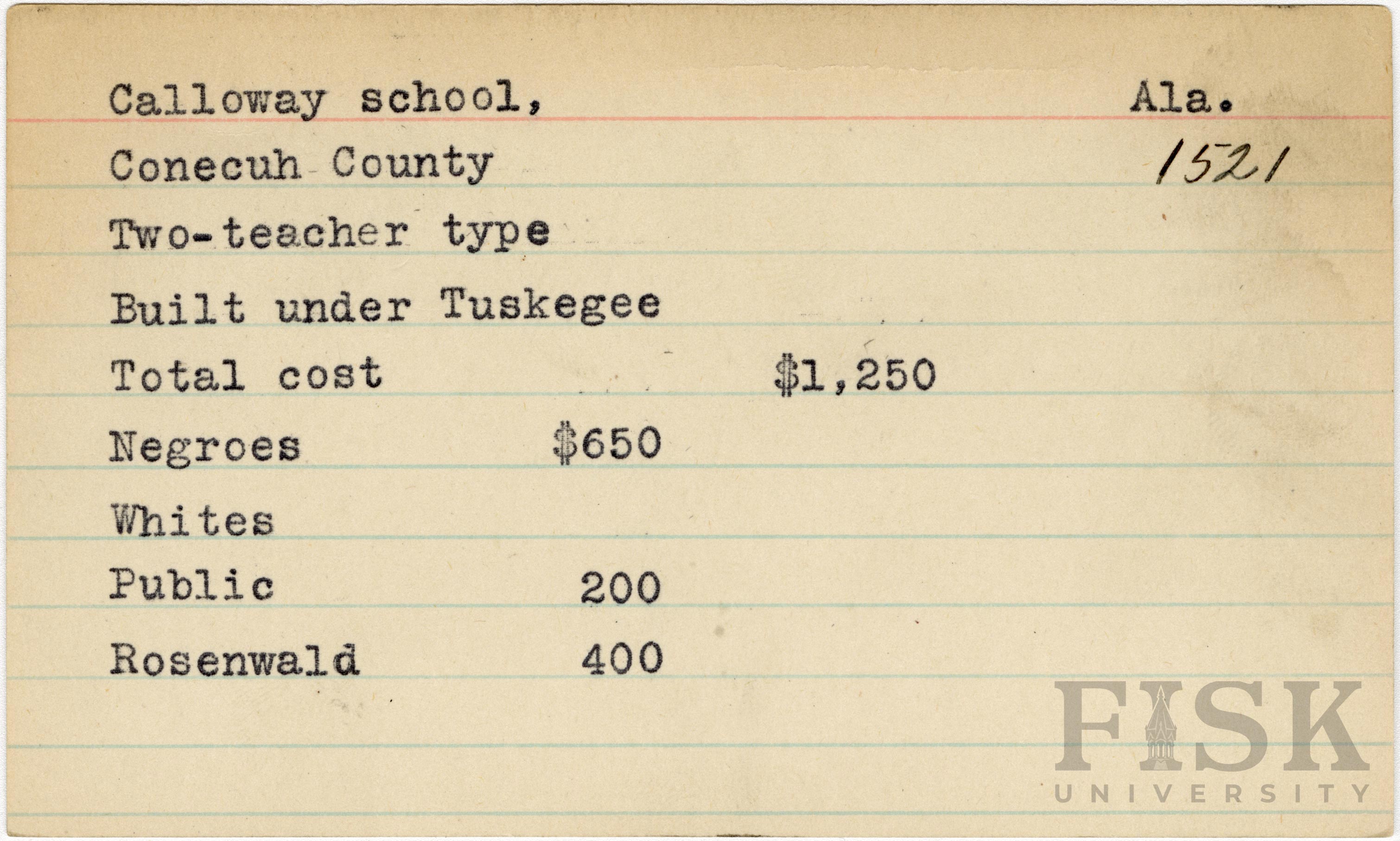 - School card from Rosenwald Fund for Calloway School in Conecuh County, Alabama
