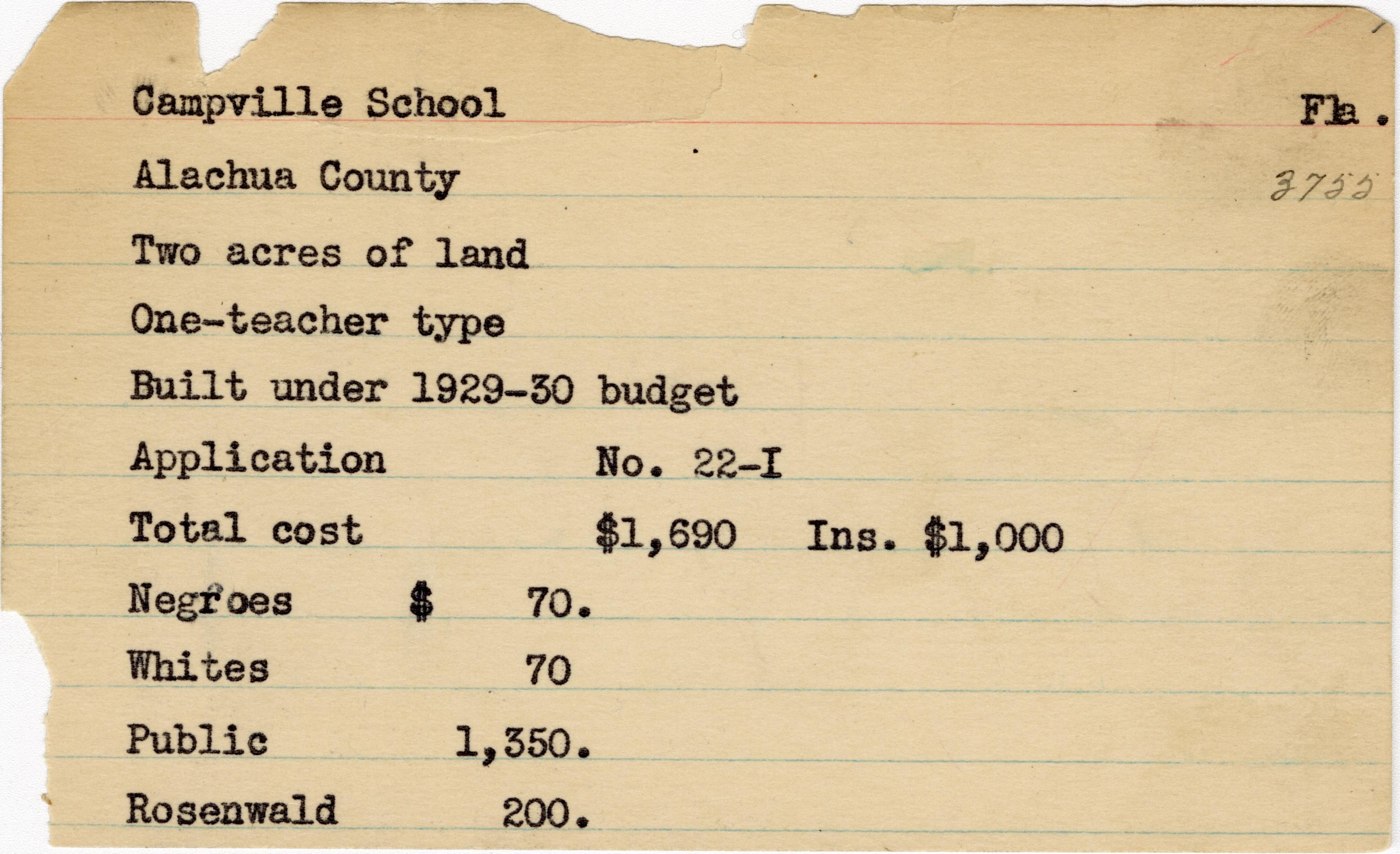 - School card from the Rosenwald Fund for Campville School in Alachua County, Florida with a section added to the budget contributions that says, "Ins. $1,000".