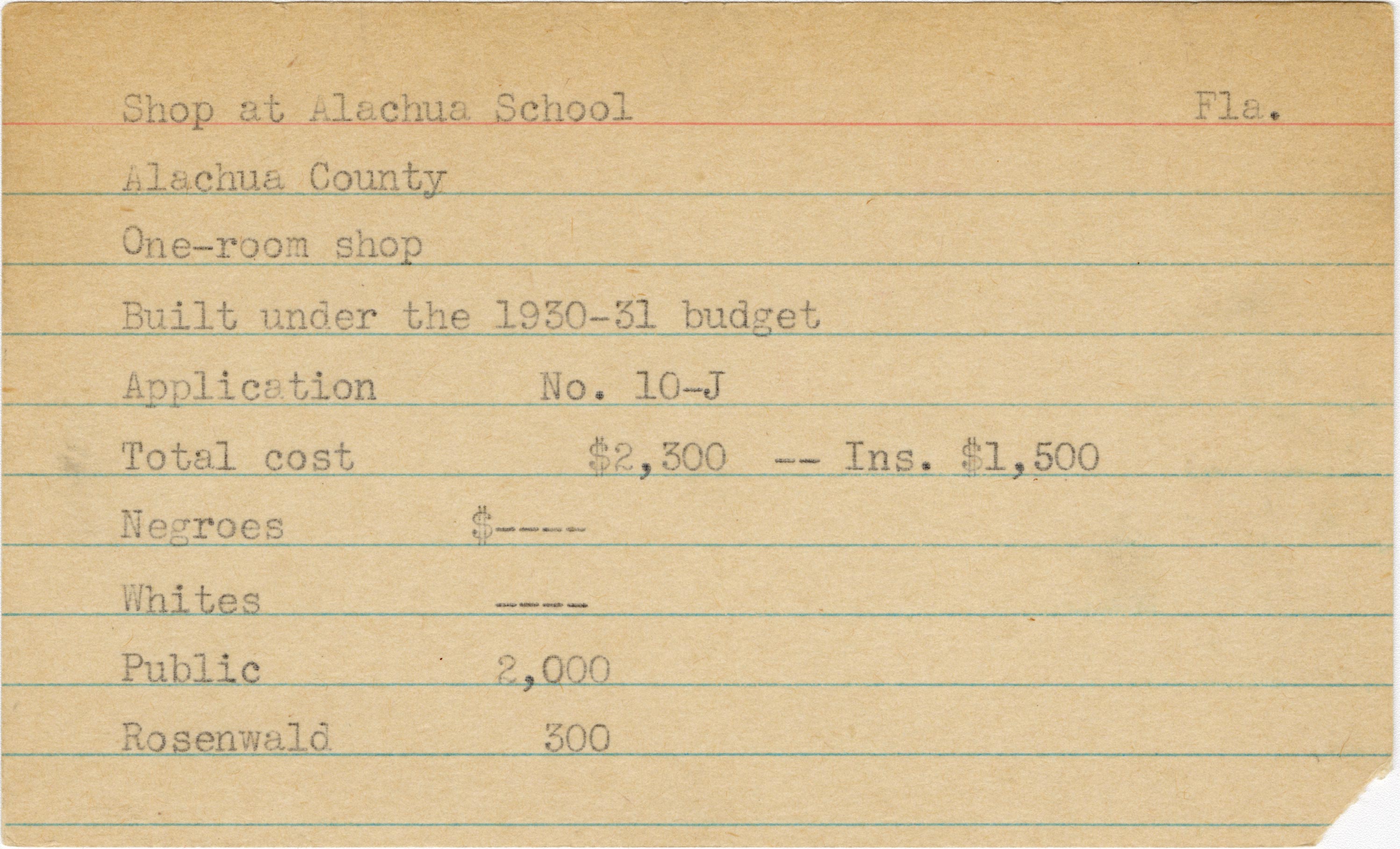 - School card from the Rosenwald Fund for the one-room shop at Alachua School in Alachua County, Florida with a section added to the budget contributions that says, "Ins. $1,500"