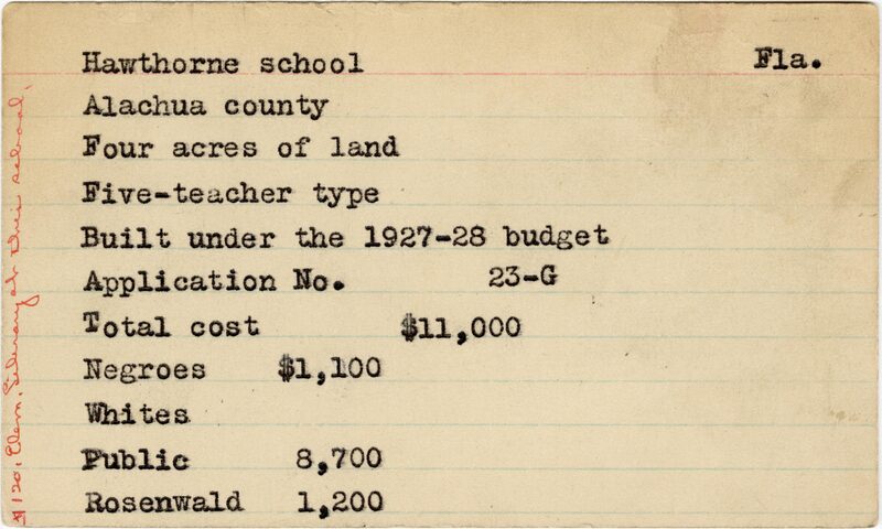 School card from the Rosenwald Fund for Hawthorne School in Alachua County, Florida with a handwritten note that says, "$120 elem. Library at this school."