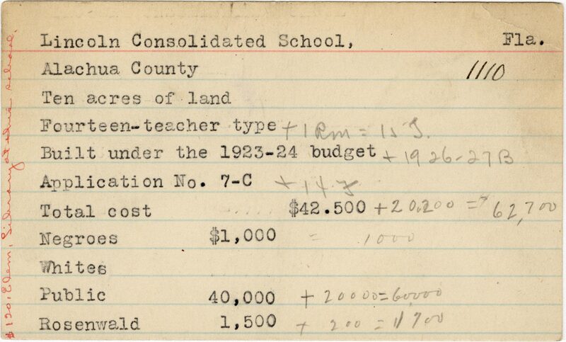 School card from the Rosenwald Fund for Lincoln Consolidated School in Alachua County, Florida with handwritten additions to the teacher type, budget year, application number, and budget contribution sections. A handwritten note on the far left of the card says "$120 elem. library at this school."