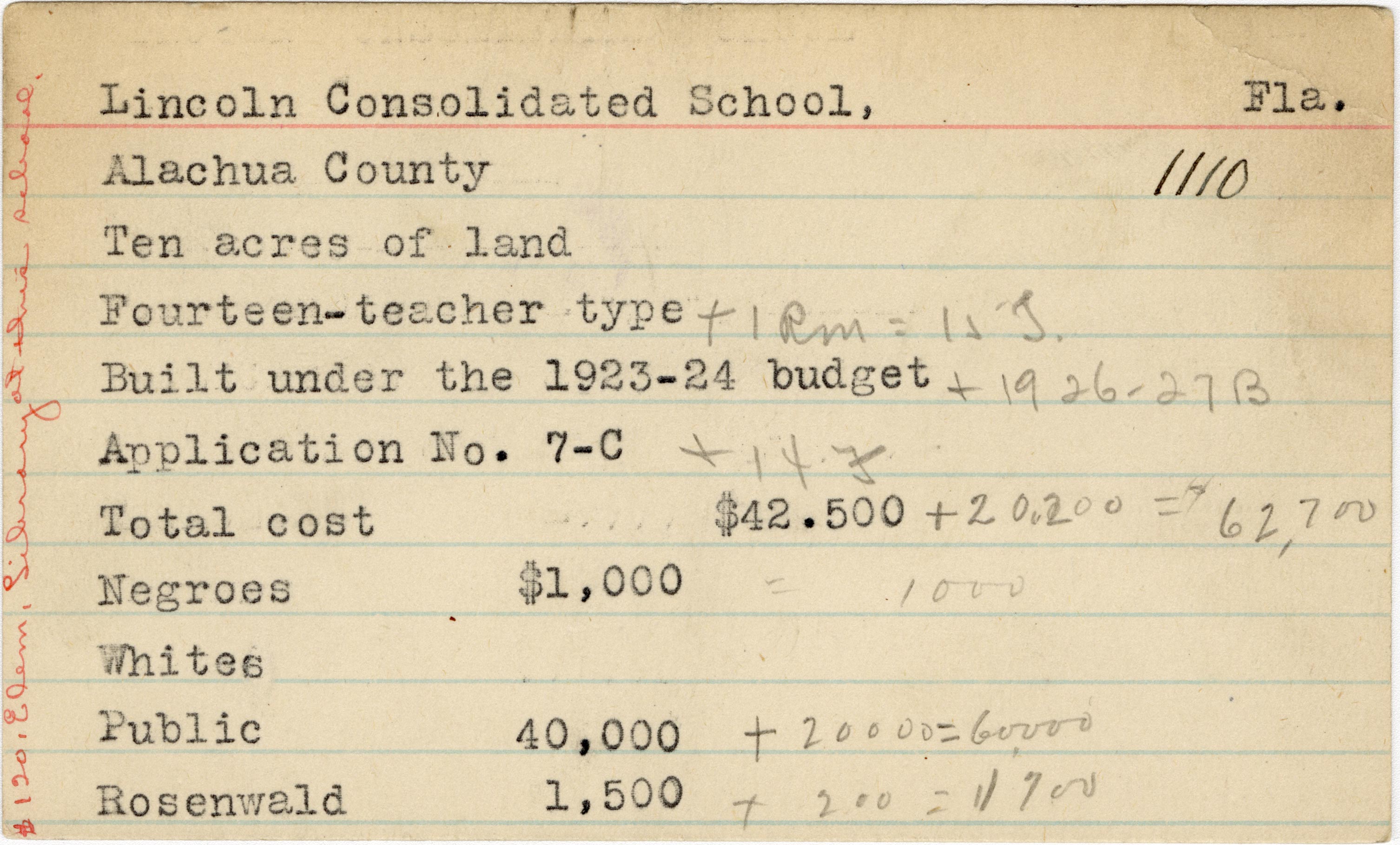 - School card from the Rosenwald Fund for Lincoln Consolidated School in Alachua County, Florida with handwritten additions to the teacher type, budget year, application number, and budget contribution sections. A handwritten note on the far left of the card says "$120 elem. library at this school."