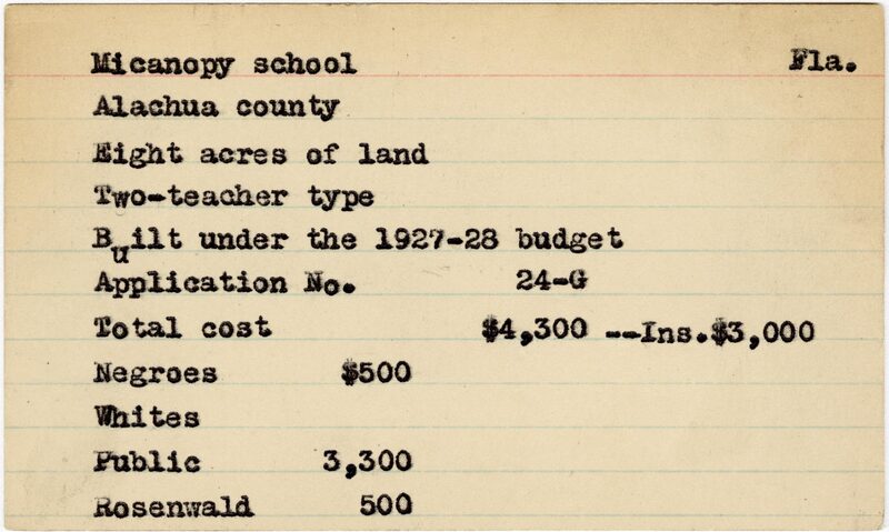 - School card from the Rosenwald Fund for Micanopy School in Alachua County, Florida with a section added to the budget contributions that says, "Ins. $3,000"