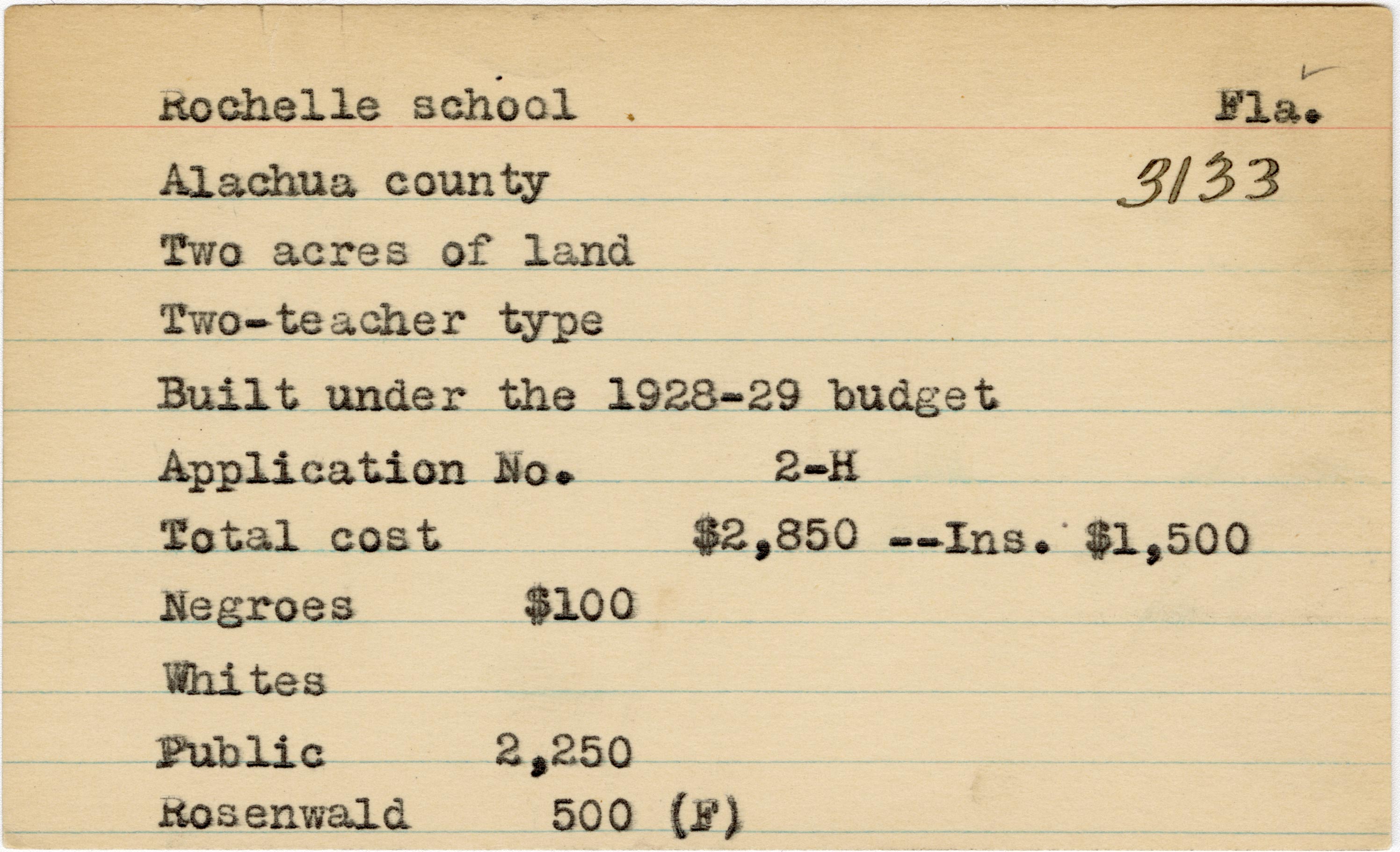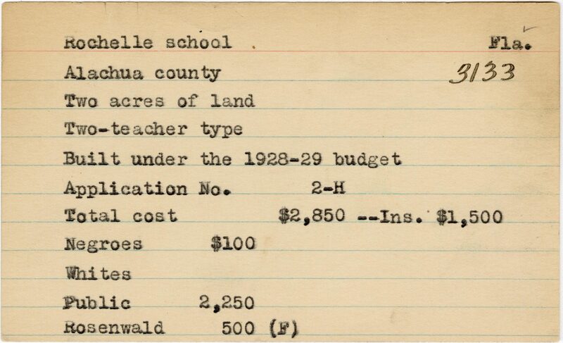 School card from the Rosenwald Fund for Rochelle School in Alachua County, Florida with a section added to the budget contributions that says, "Ins. $1,500"