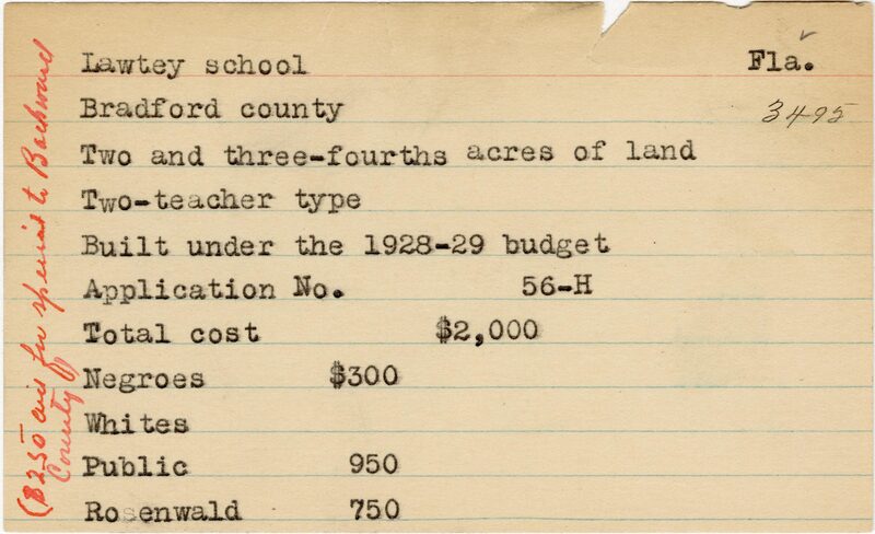 - School card from the Rosenwald Fund for Lawtey School in Bradford County, Florida with a handwritten note on the far left that says, "$250 aud for special to Backward County"