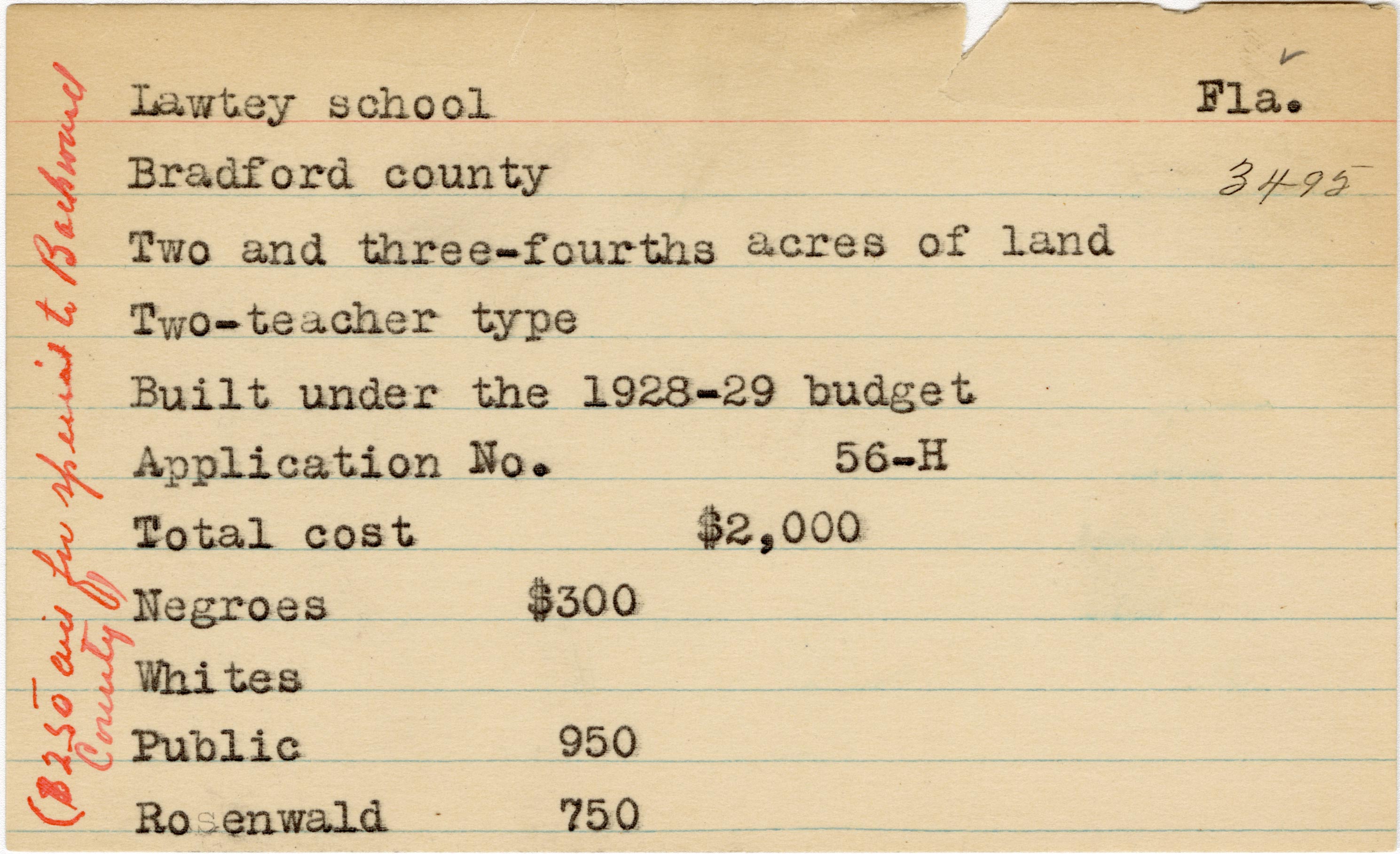 School card from the Rosenwald Fund for Lawtey School in Bradford County, Florida with a handwritten note on the far left that says, "$250 aud for special to Backward County"