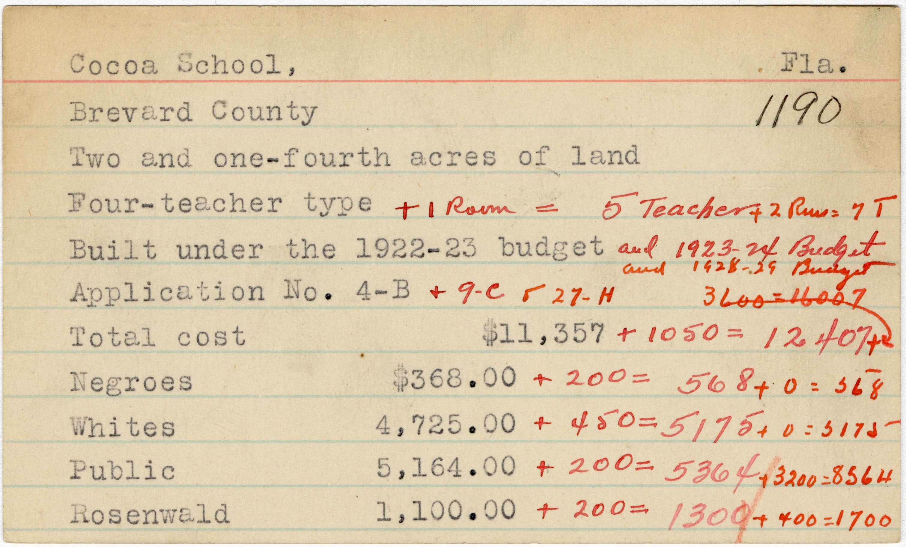 School card from the Rosenwald Fund for Cocoa School in Brevard County, Florida with handwritten additions to the teacher type, budget year, application number, and budget contribution sections