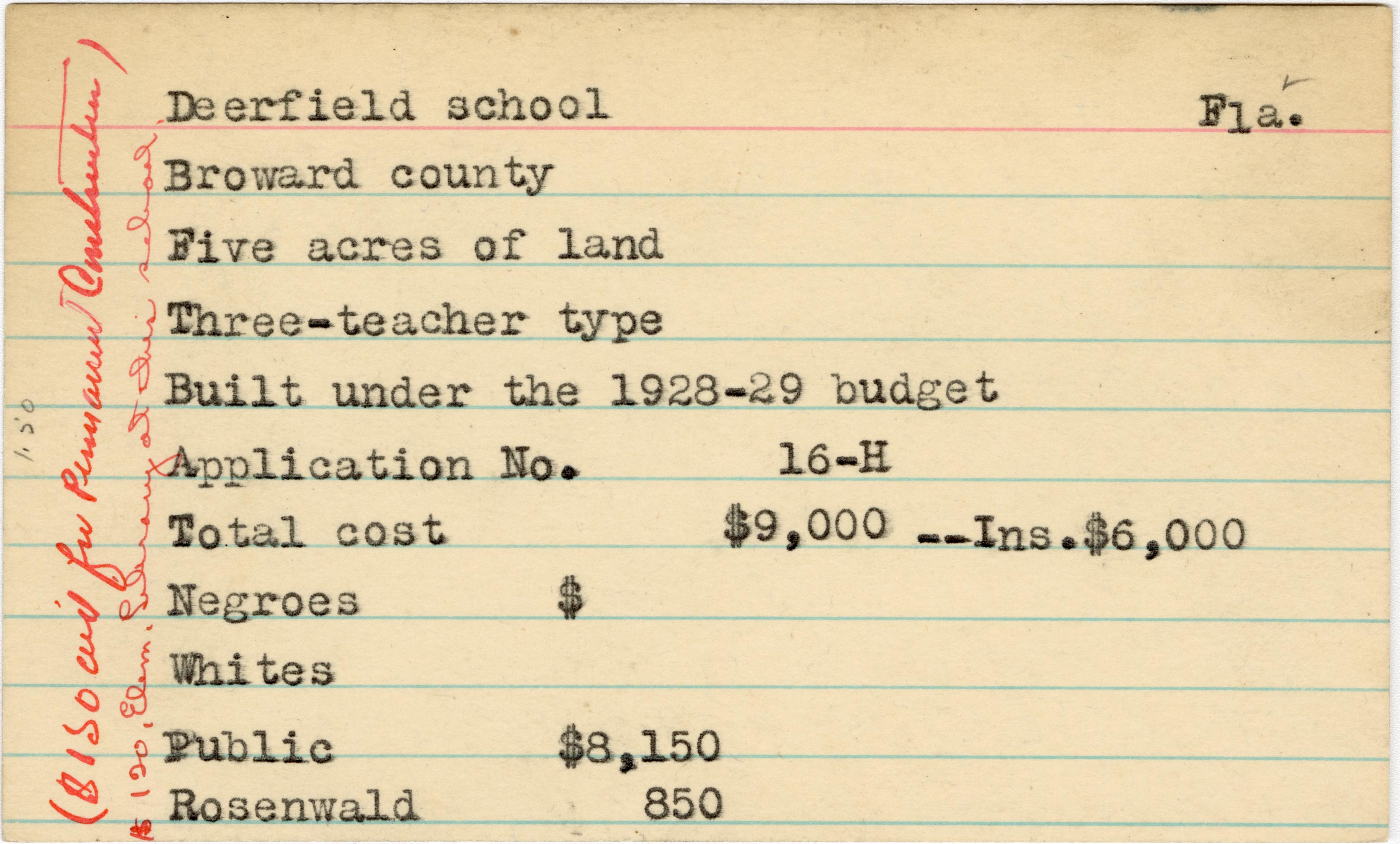 - School card from the Rosenwald Fund for Deerfield School in Broward County, Florida with a section added to the budget contributions that says, "Ins. $6,000". Handwritten notes on the far left of the card say, "$150 aid for permanent instructor" and "$120 elem. Library at this school".