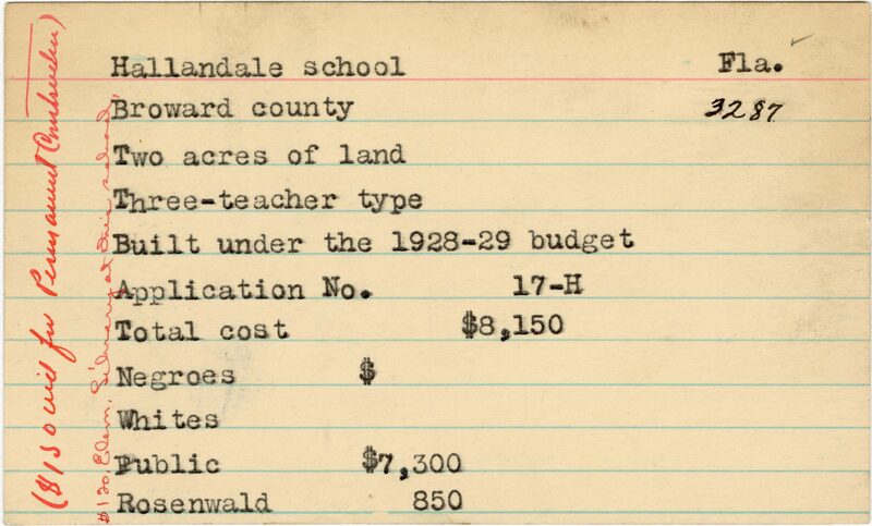 - School card from the Rosenwald Fund for Hallandale School in Broward County, Florida. Handwritten notes on the far left of the card say, "$150 aid for permanent instructors" and "$120 elem library at this school."