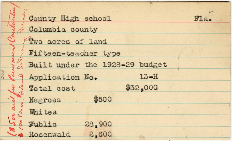 School card from the Rosenwald Fund for County High School in Columbia County, Florida with handwritten notes on the far left of the card that say, "($500 aid for permanent instructors)" and "$120 elem... Library here".