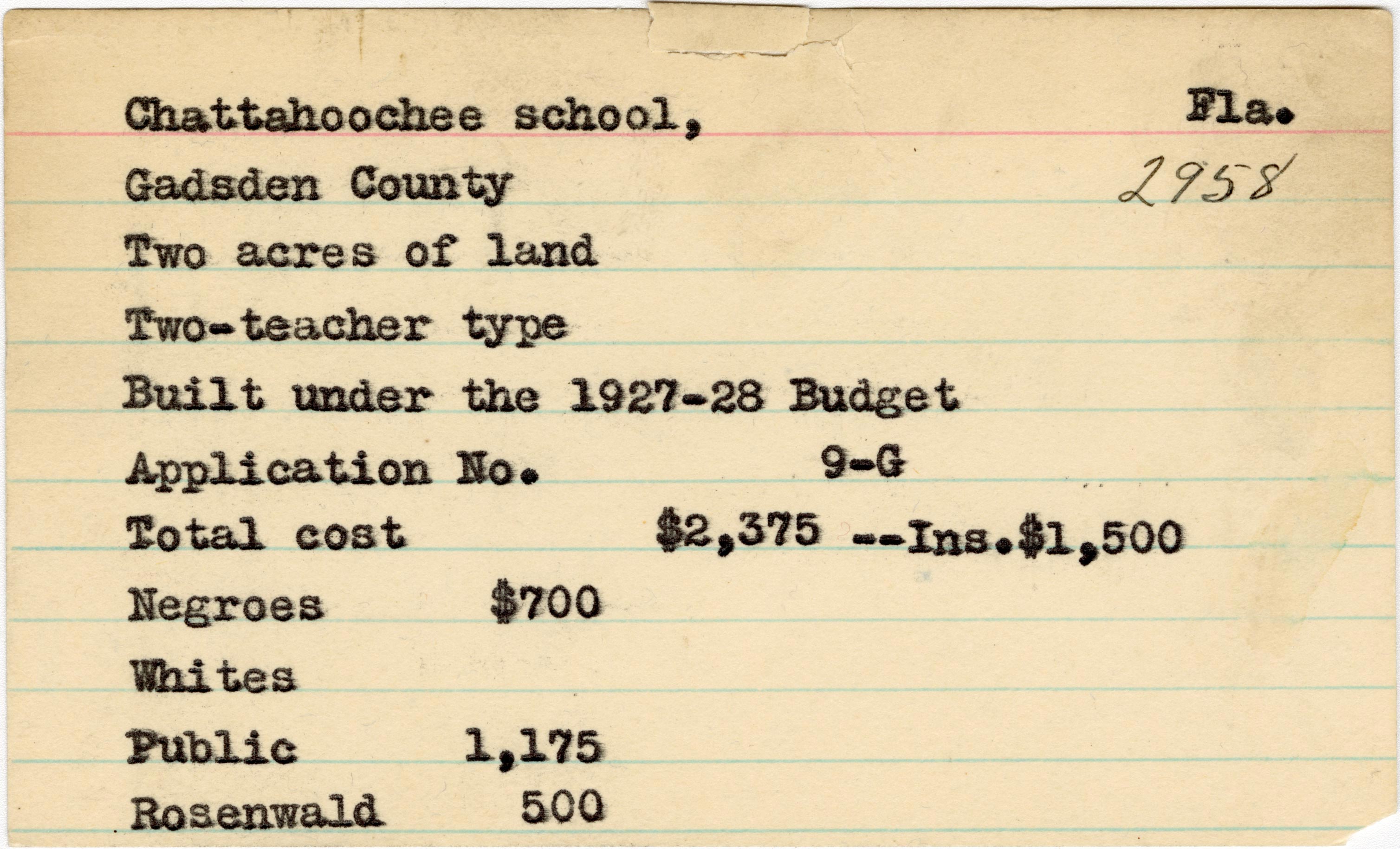 - School card from the Rosenwald Fund for Chattahoochee School in Gadsden County, Florida with a section added to the budget contributions that says, "Ins. $1,500".