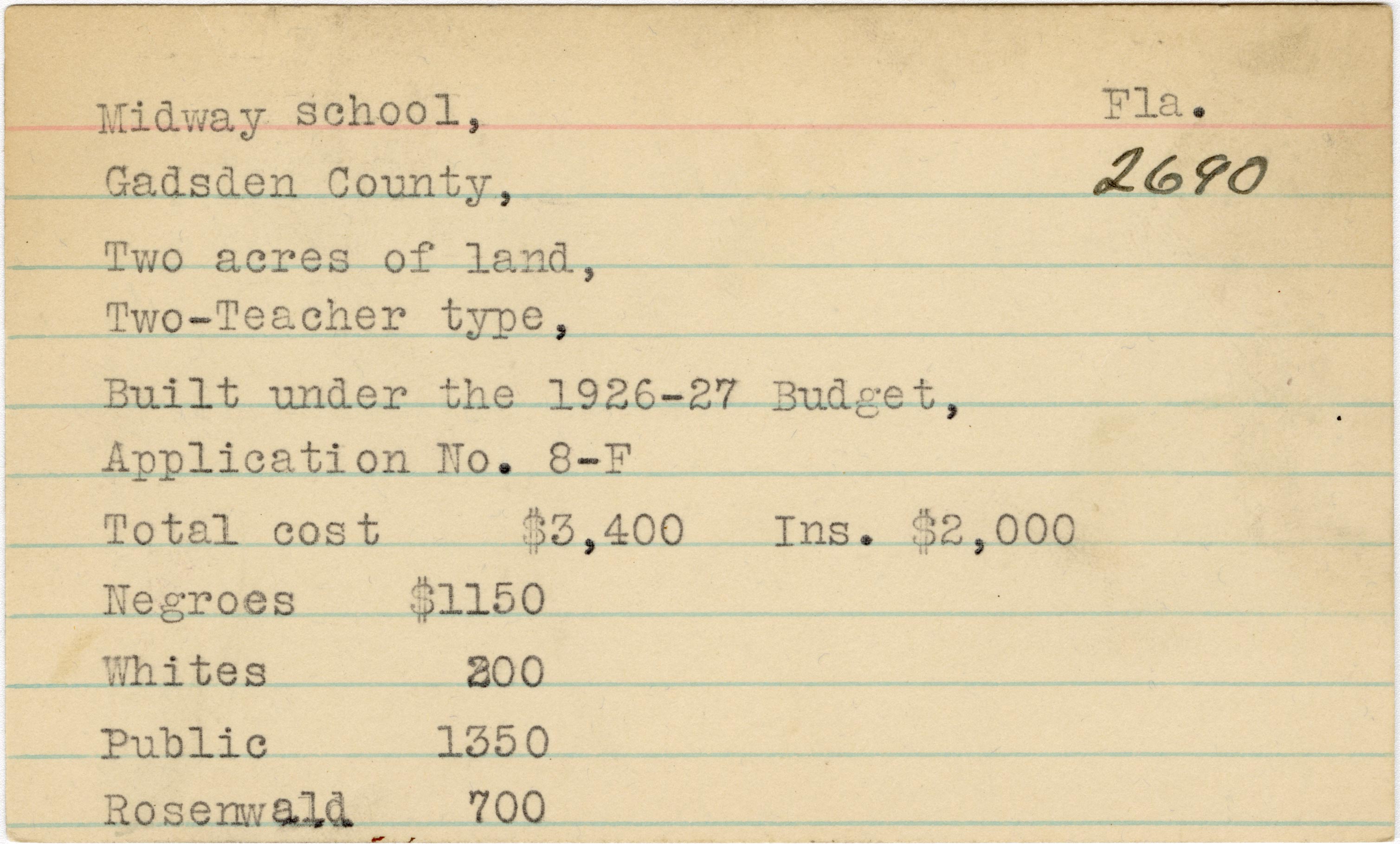 - School card from the Rosenwald Fund for Midway School in Gadsden County, Florida with a section added to the budget contributions that says, "Ins. $2,000".