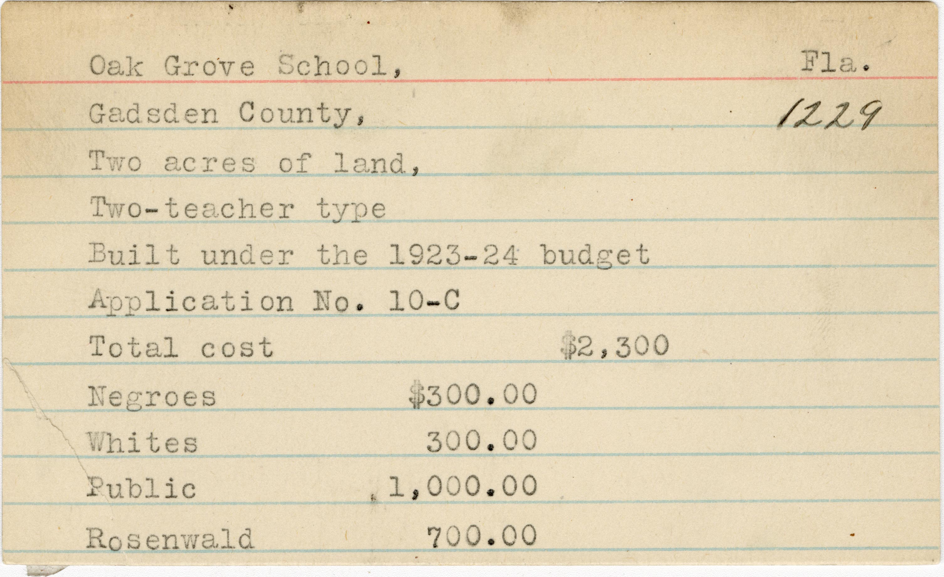 - School card from the Rosenwald Fund for Oak Grove School in Gadsden County, Florida