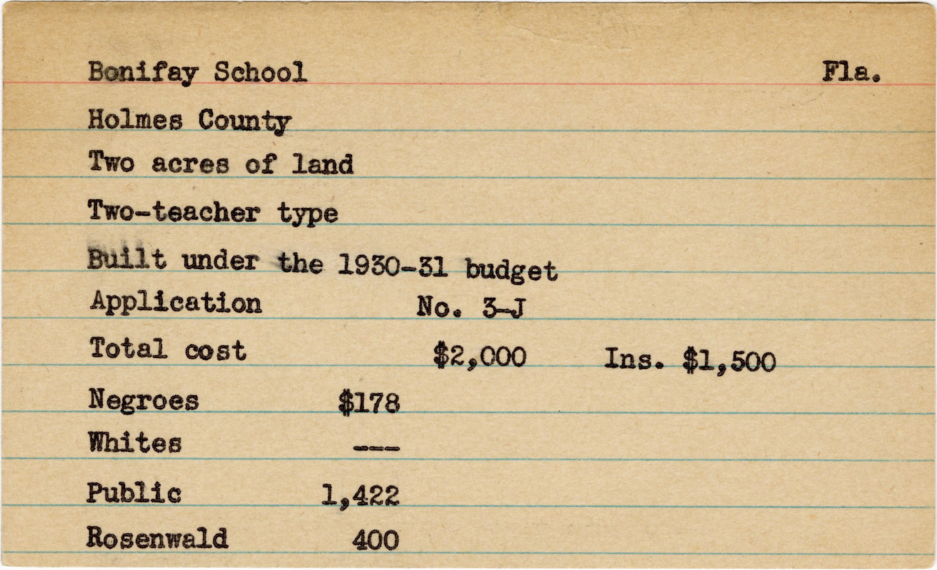 School card from the Rosenwald Fund for Bonifay School in Holmes County, Florida with a section added to the budget contributions that says, "Ins. $1,500".