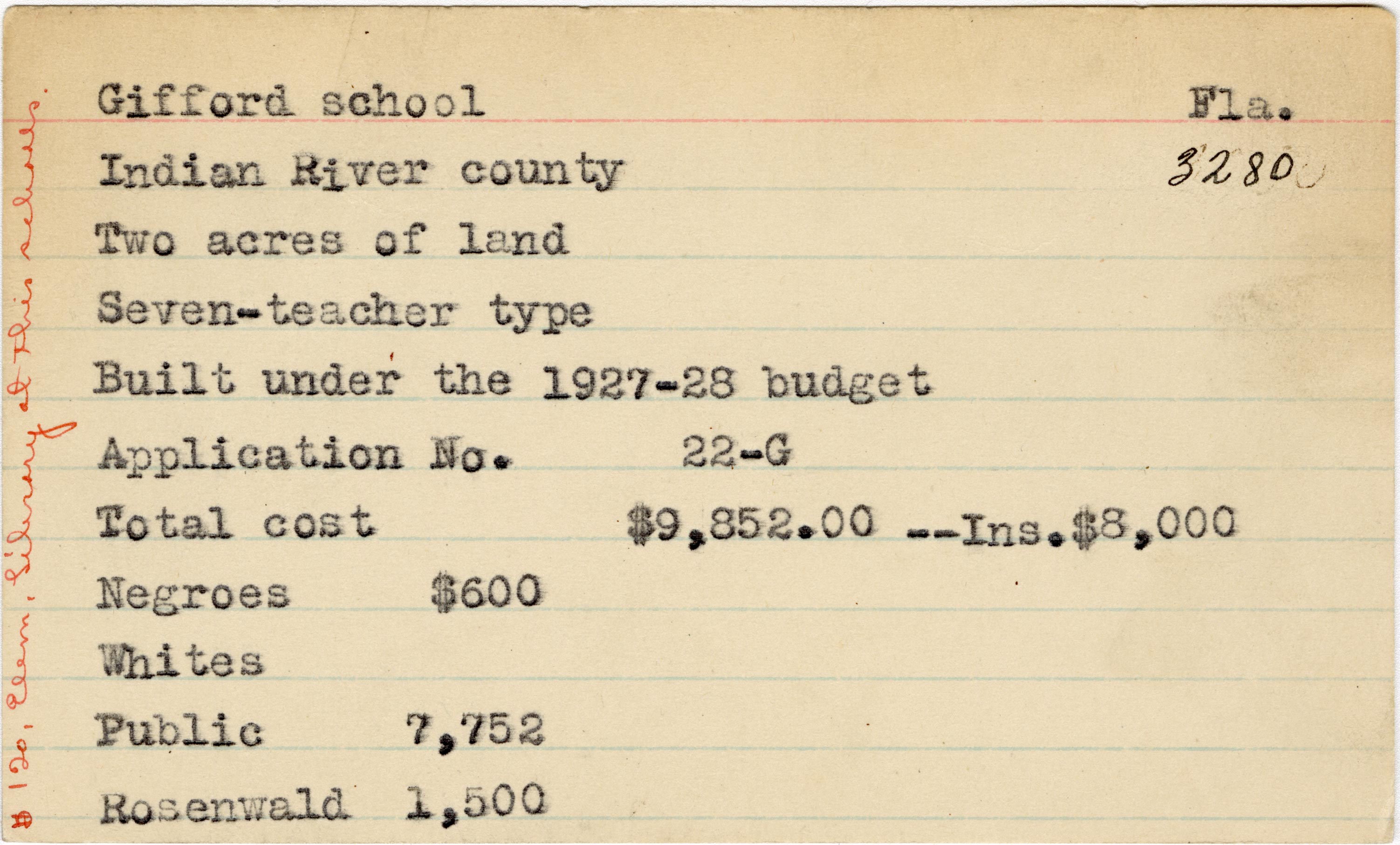 School card from the Rosenwald Fund for Gifford School in Indian River County, Florida with a section added to the budget contributions that says, "Ins. $8,000" and a handwritten note that says, "$120 elem library at this school".