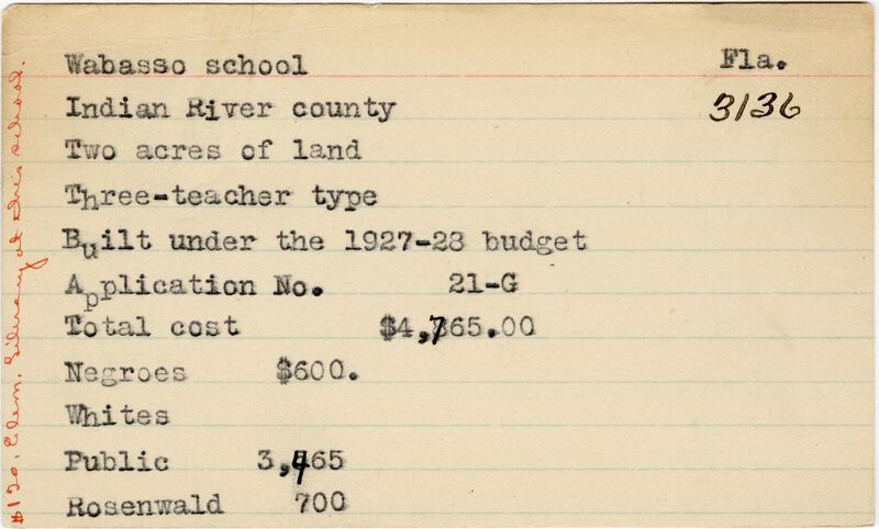 - School card from the Rosenwald Fund for Wabasoo School in Indian River County, Florida with a handwritten note on the far left of the card that says, "$120 elem library at this school".