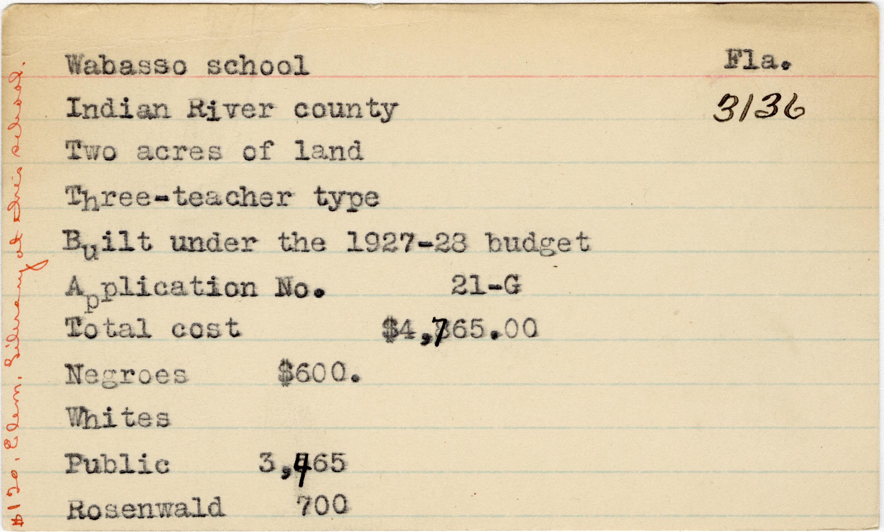 School card from the Rosenwald Fund for Wabasoo School in Indian River County, Florida with a handwritten note on the far left of the card that says, "$120 elem library at this school".