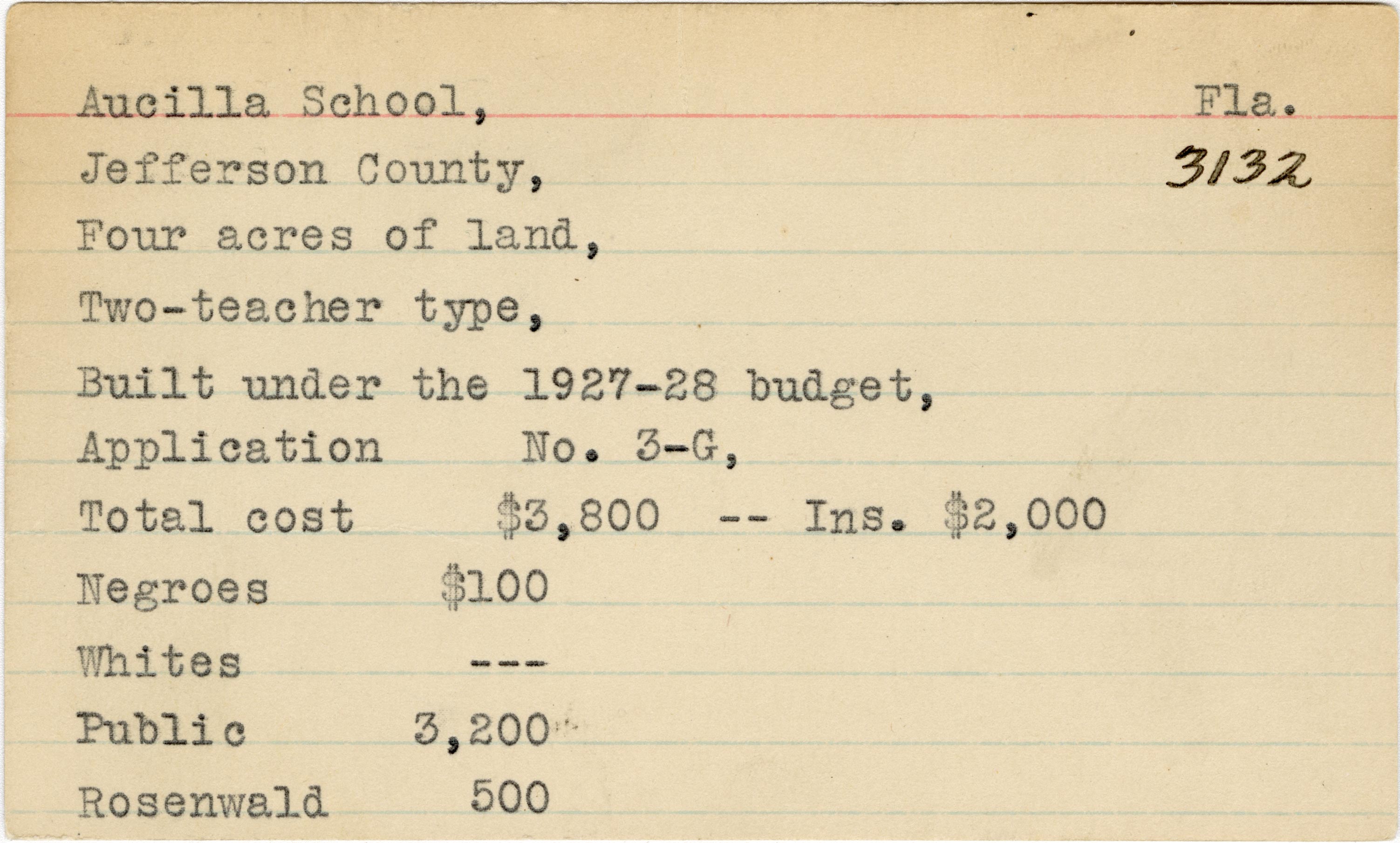 School card from the Rosenwald Fund for Aucilla School in Jefferson County, Florida with a section added to the budget contributions that says, "Ins. $2,000".