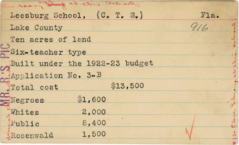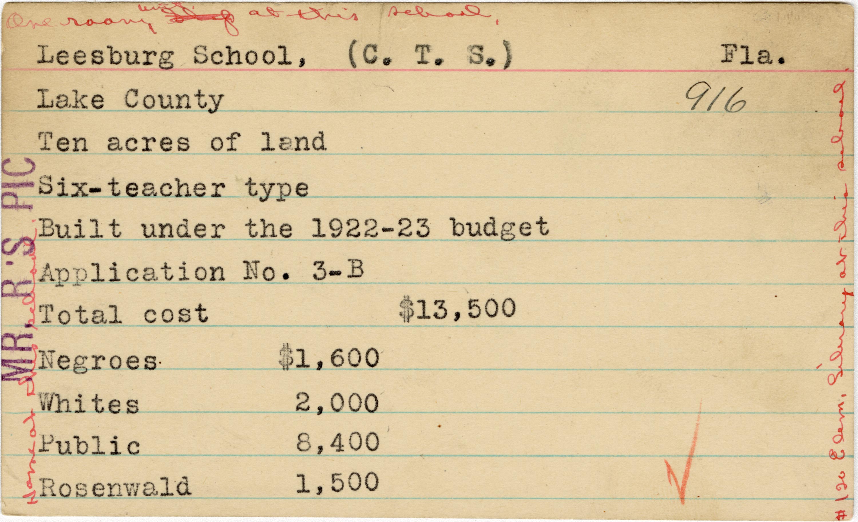 - School card from the Rosenwald Fund for Leesburg School in Lake County, Florida with notes that say, "Mr. R's Pic", "Home at this school", "One room shop at this school", and "$120 elem library at this school".