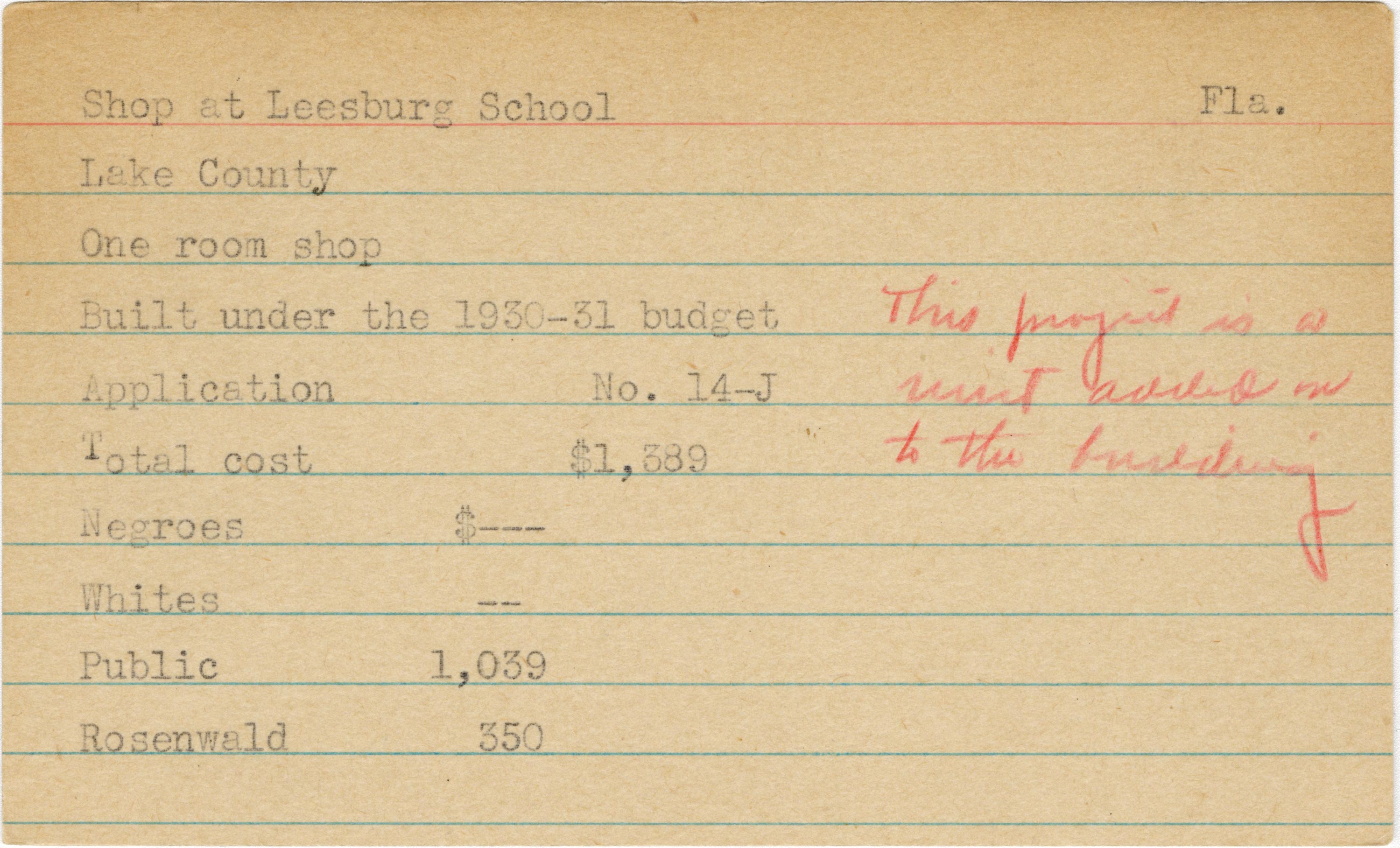 - School card from the Rosenwald Fund for the one-room shop at Leesburg School in Lake County, Florida. A handwritten note says, "This project is a room added on to the building".