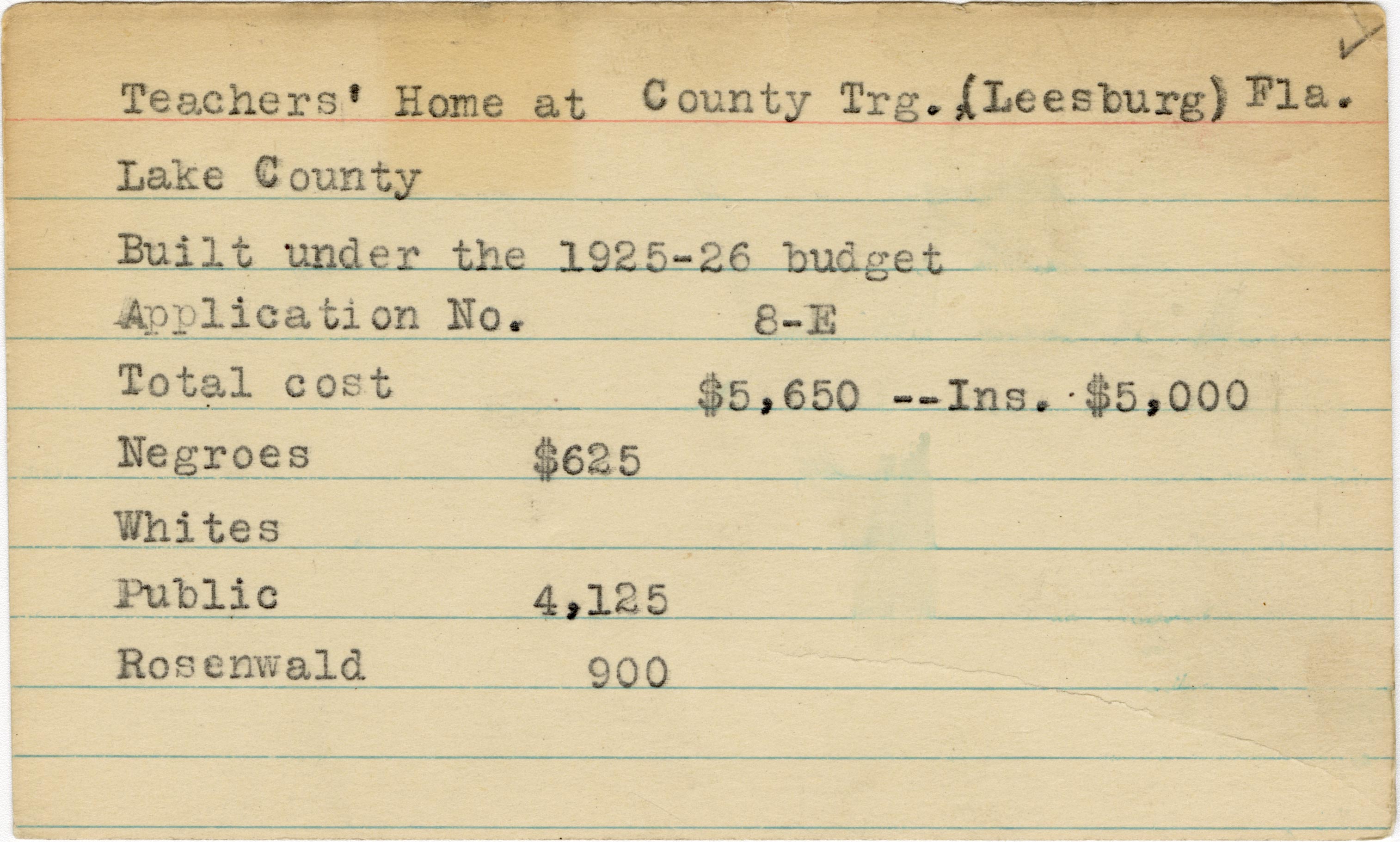 School card from the Rosenwald Fund for the teacher's home at Leesburg School in Lake County, Florida with a section added to the budget contributions that says, "Ins. $5,000".