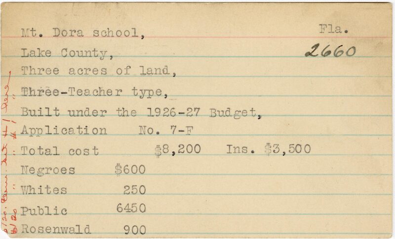 - School card from the Rosenwald Fund for Mt. Dora School in Lake County, Florida with a section added to the budget contributions that says, "Ins. $3,500". A handwritten note on the far left of the card that says, "$120 elem lib here".
