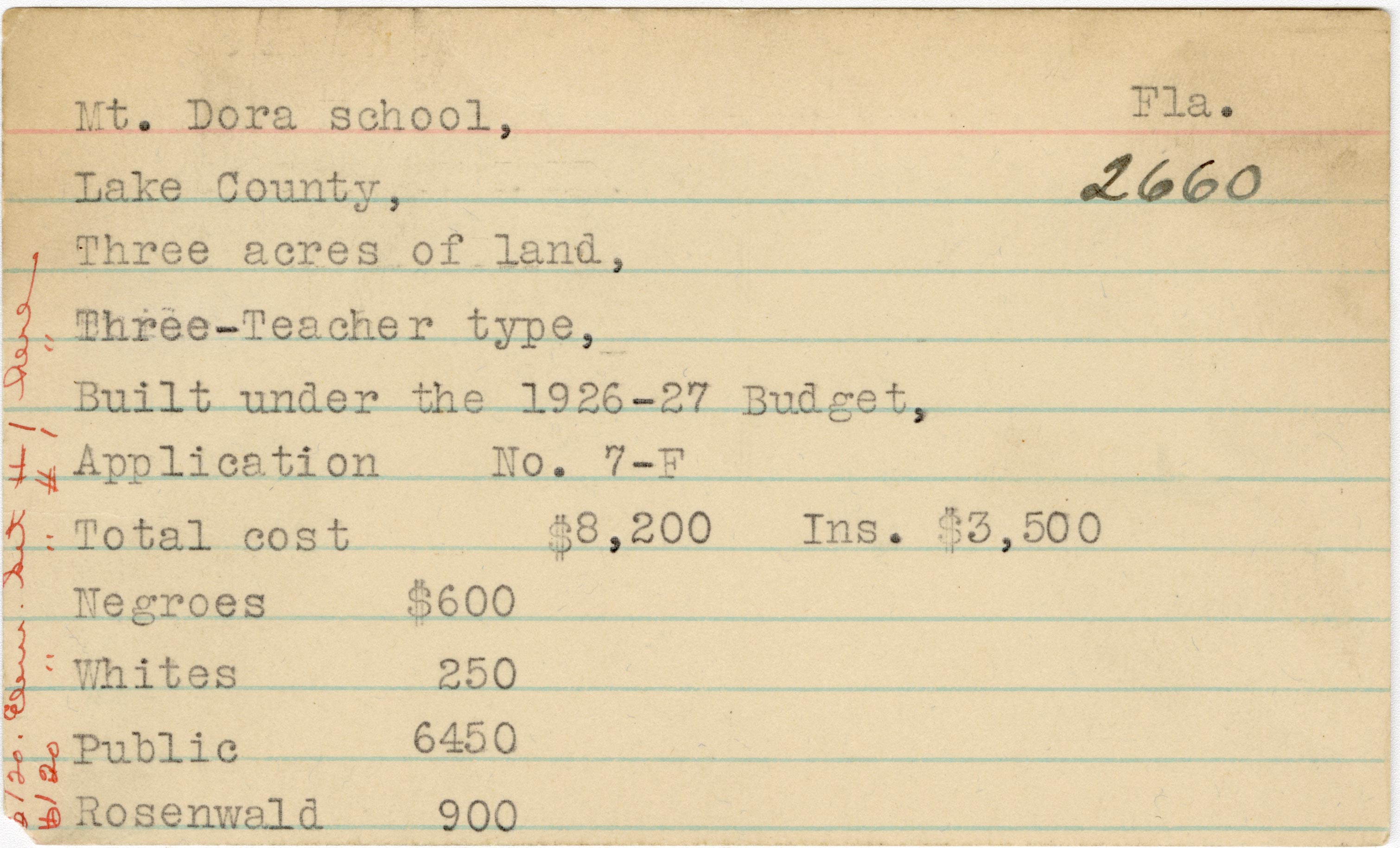 School card from the Rosenwald Fund for Mt. Dora School in Lake County, Florida with a section added to the budget contributions that says, "Ins. $3,500". A handwritten note on the far left of the card that says, "$120 elem lib here".