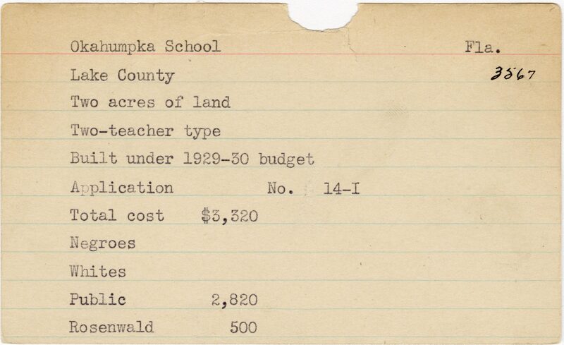- School card from the Rosenwald Fund for Okahumpka School in Lake County, Florida. The photo card lists the county name for this school as Marion County.