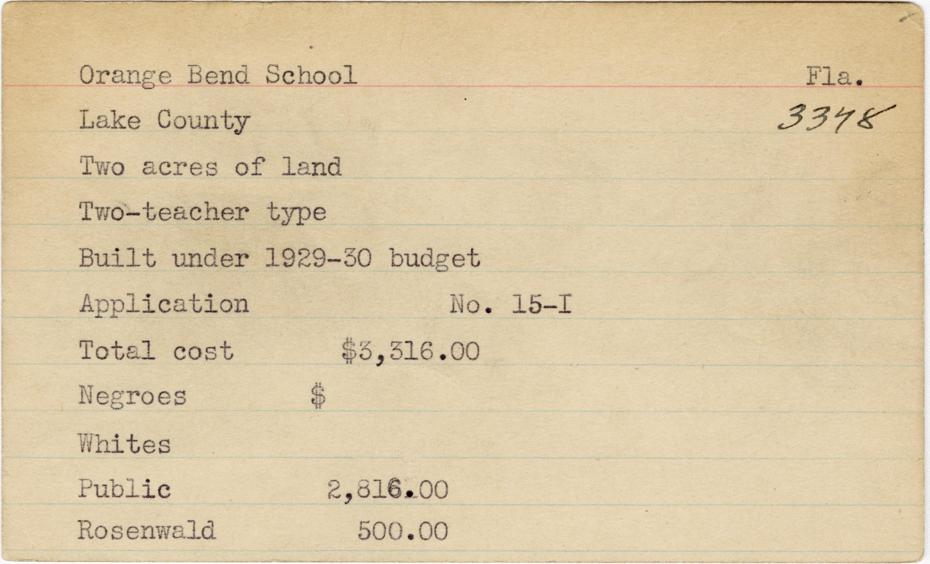 - School card from the Rosenwald Fund for Orange Bend School in Lake County, Florida