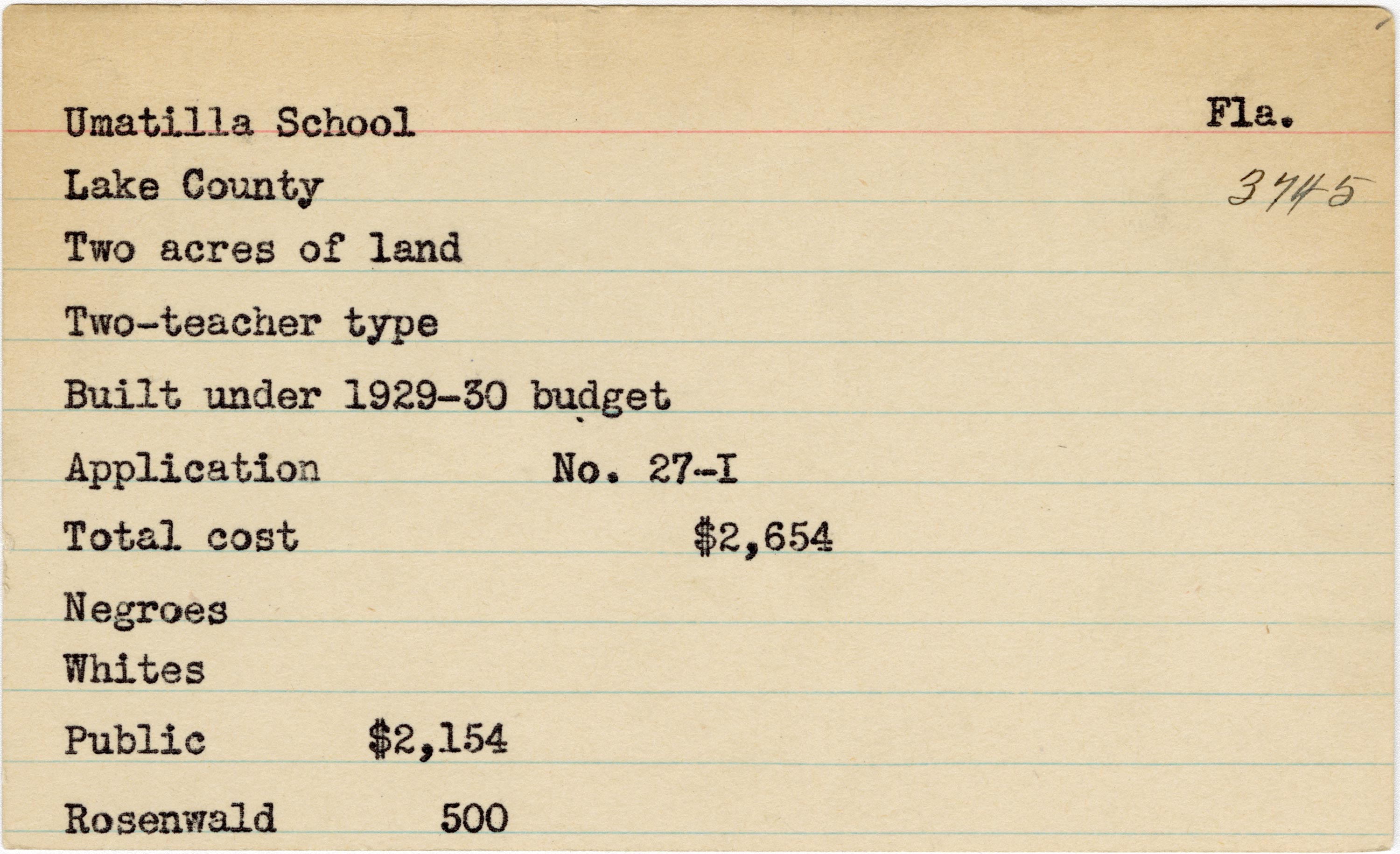 - School card from the Rosenwald Fund for Umatilla School in Lake County, Florida