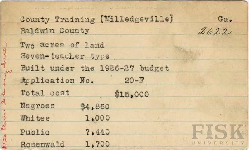 School card from Rosenwald Fund for County Training School in Baldwin County, Georgia with a handwritten note on the far left of the card that says, "$120 elem library here"