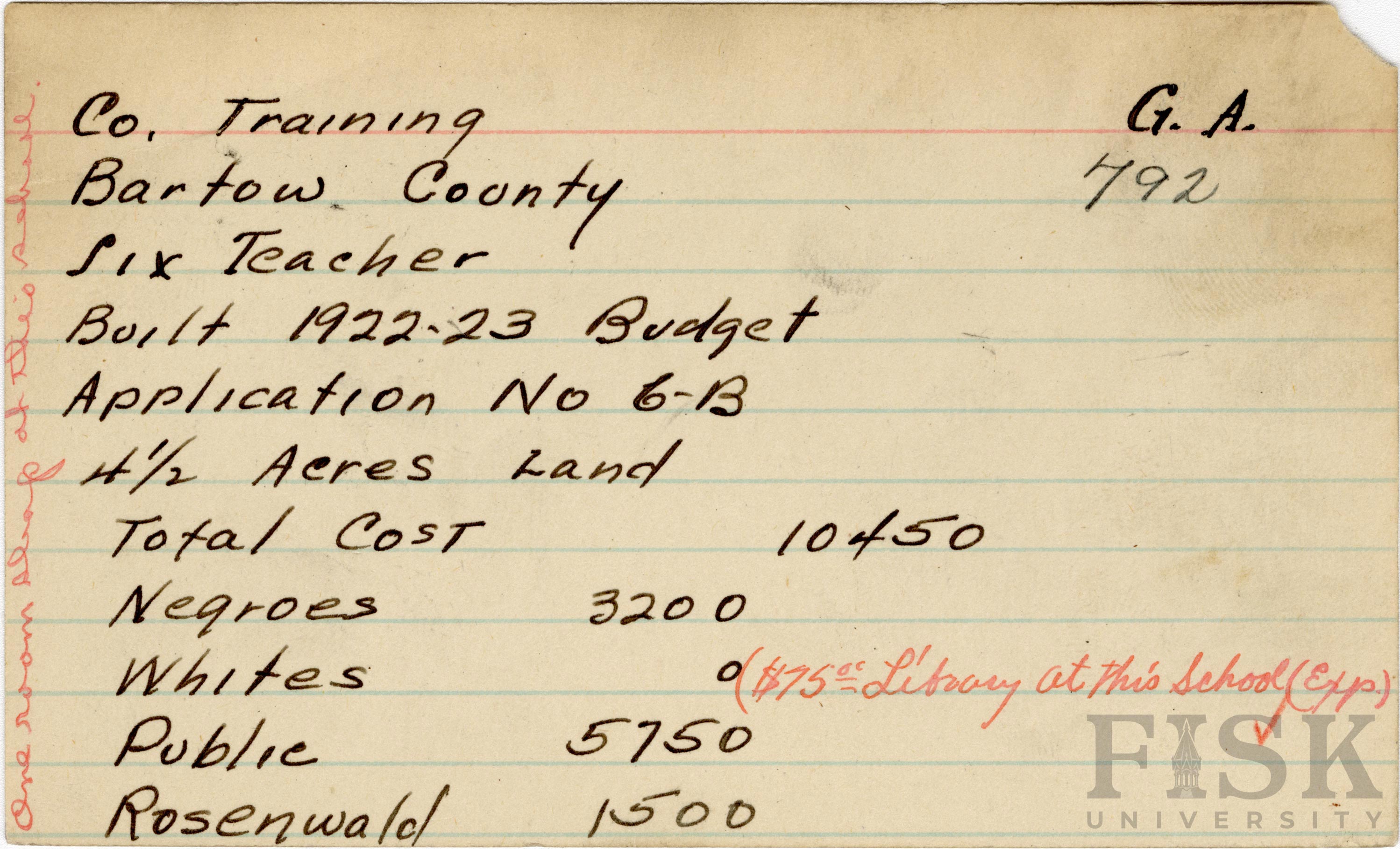 School card from Rosenwald Fund for County Training School in Bartow County, Georgia with handwritten notes added that say, "one room shop at this school" and "($75.00 library at this school (Exp)"