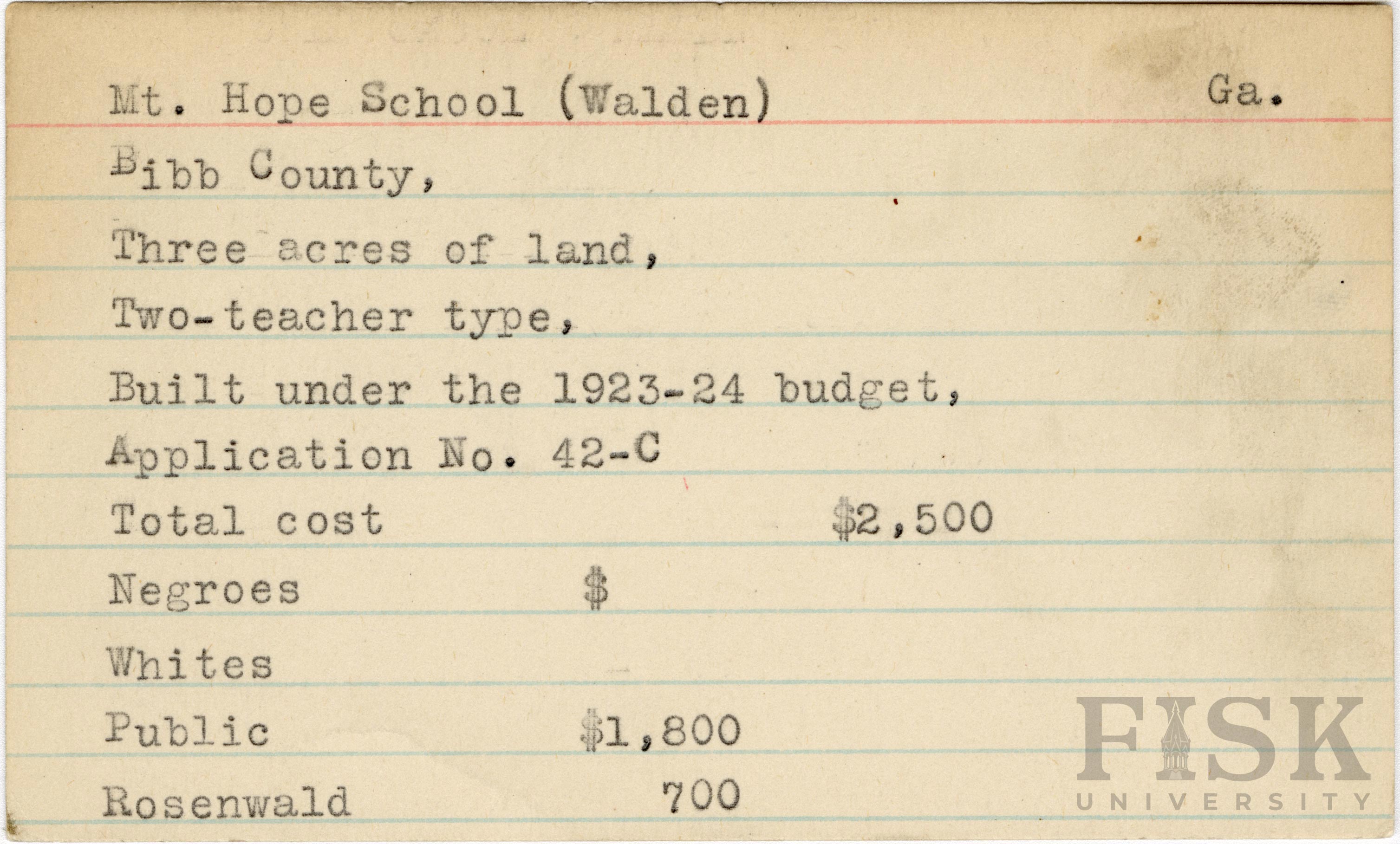 - School card from Rosenwald Fund for Mt. Hope School in Bibb County, Georgia