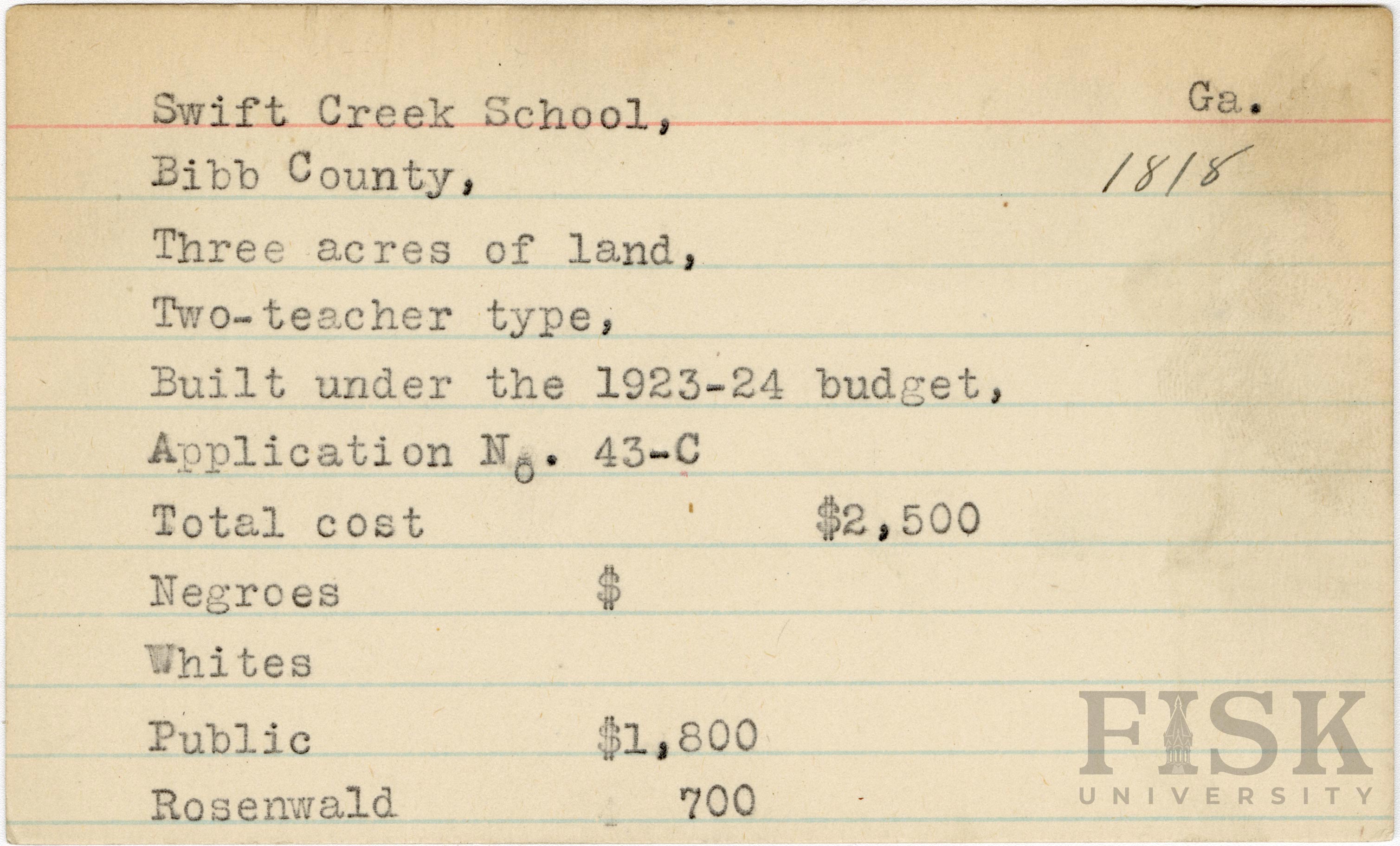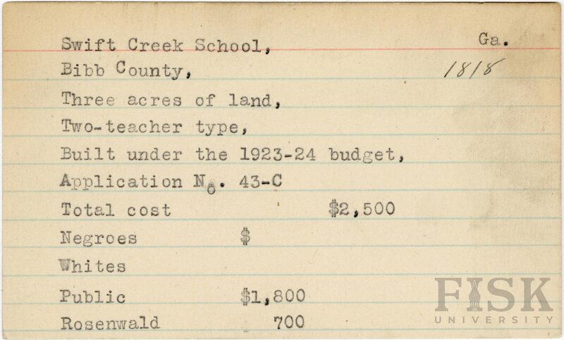 - School card from Rosenwald Fund for Swift Creek School in Bibb County, Georgia