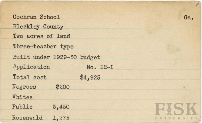 - School card from Rosenwald Fund for Cochran School in Bleckley County, Georgia