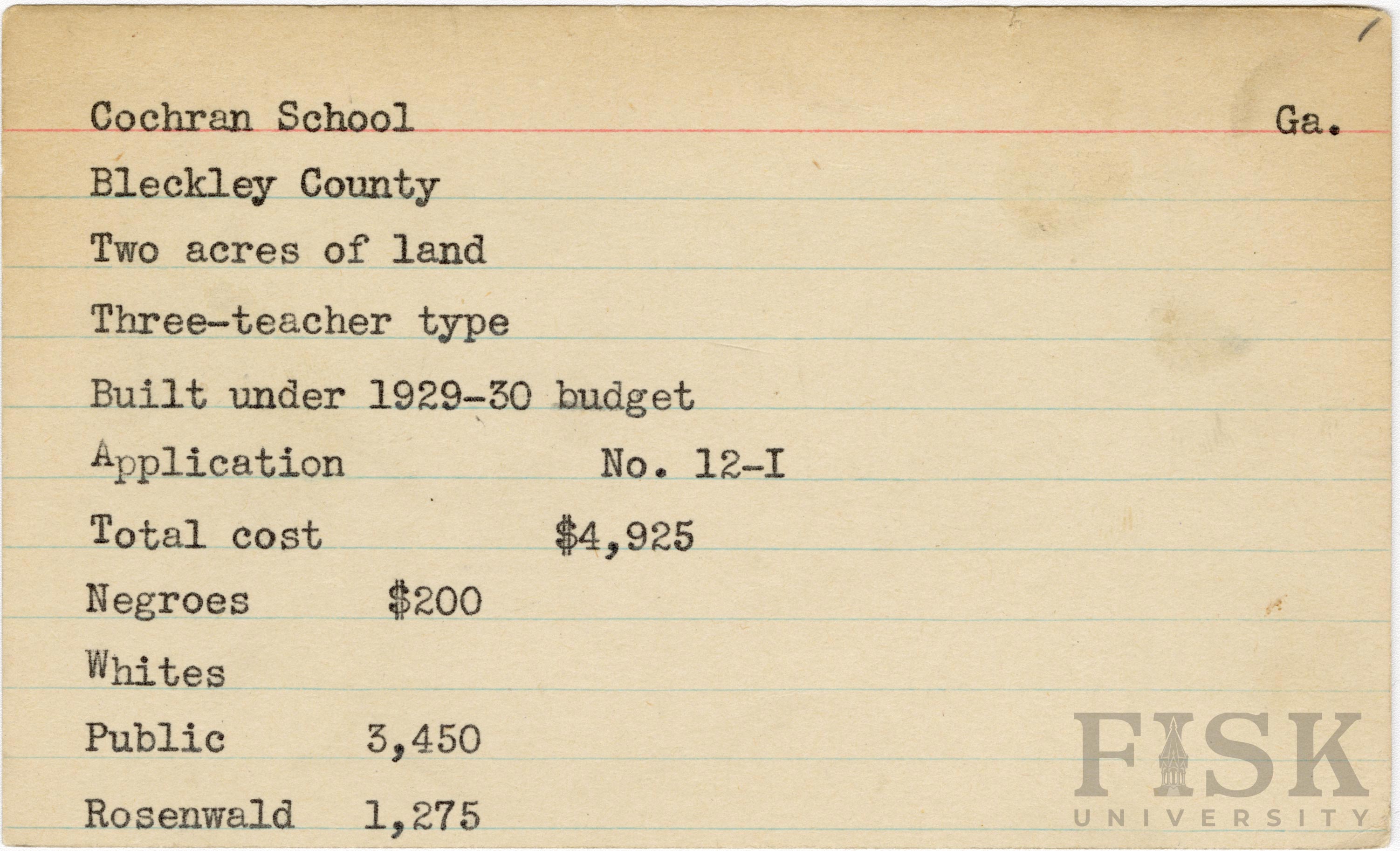 School card from Rosenwald Fund for Cochran School in Bleckley County, Georgia