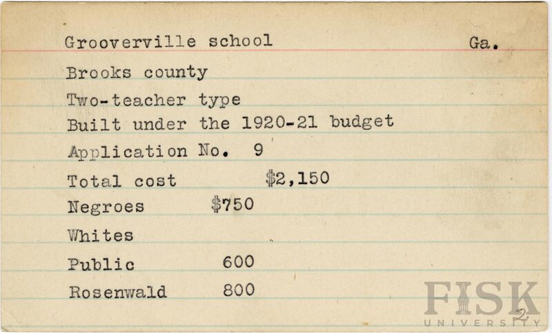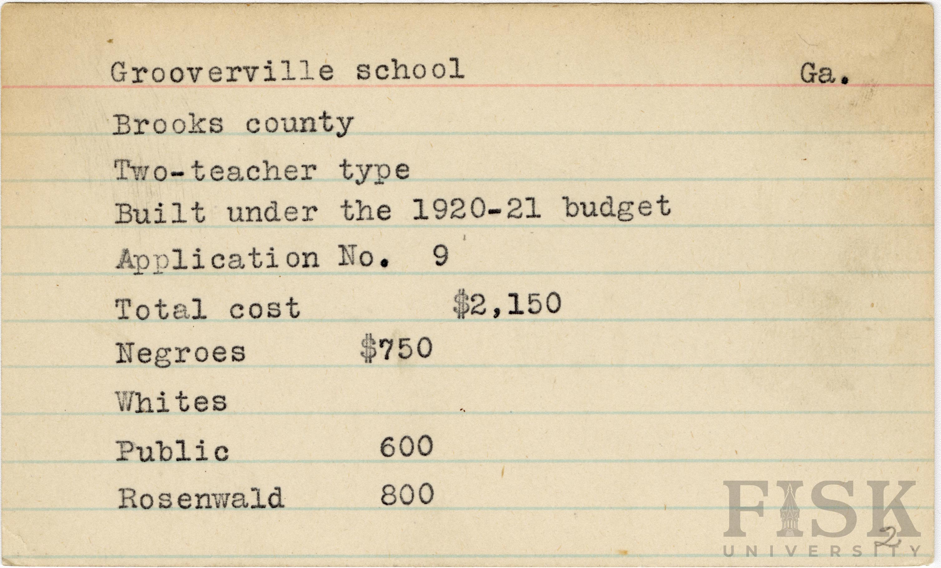 - School card from Rosenwald Fund for Grooverville School in Brooks County, Georgia