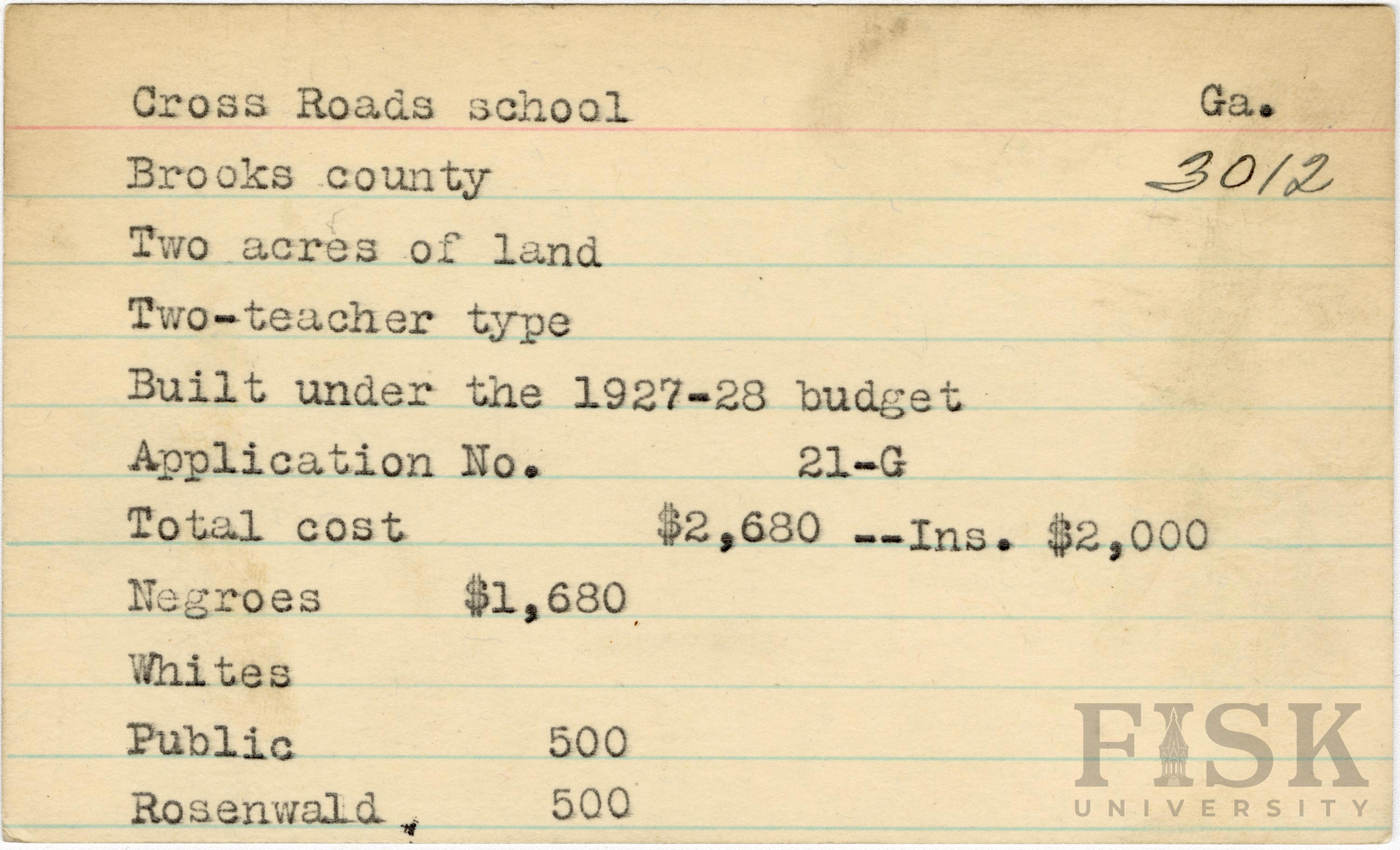 School card from Rosenwald Fund for Cross Roads School in Brooks County, Georgia with a section added to the budget contributions that says, "Ins. $2,000"