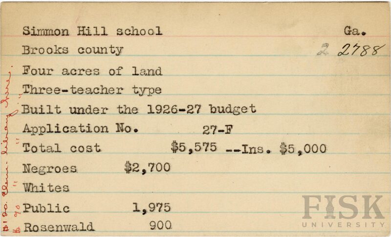 School card from Rosenwald Fund for Simmon Hill School in Brooks County, Georgia with a section added to the budget contributions that says, "Ins. $5,000" and two handwritten notes on the far left of the card that says, "$120 elem library here" and "$90"