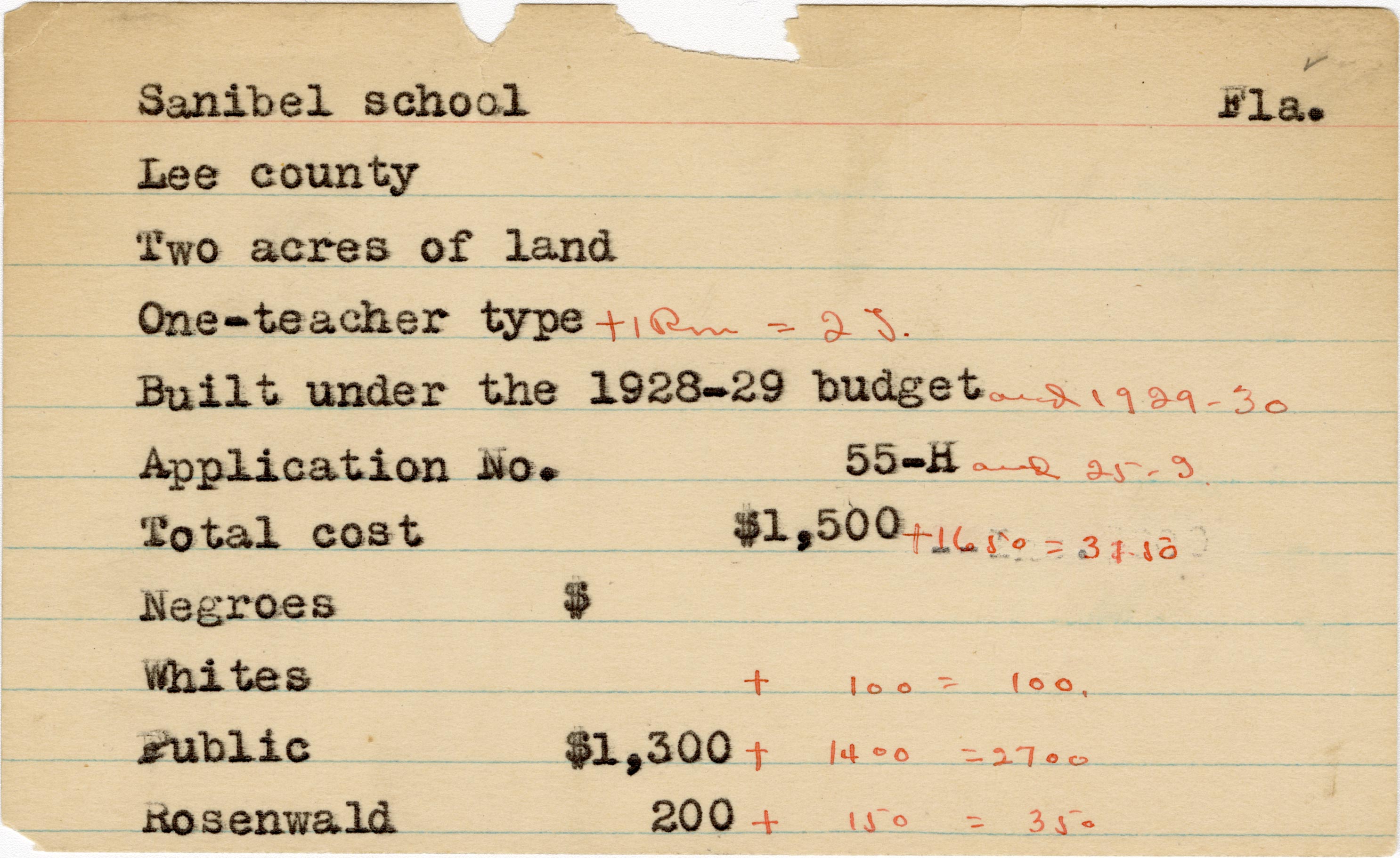 School card from the Rosenwald Fund for Sanibel School in Lee County, Florida with handwritten additions to the teacher type, budget year, application number, and budget contribution sections