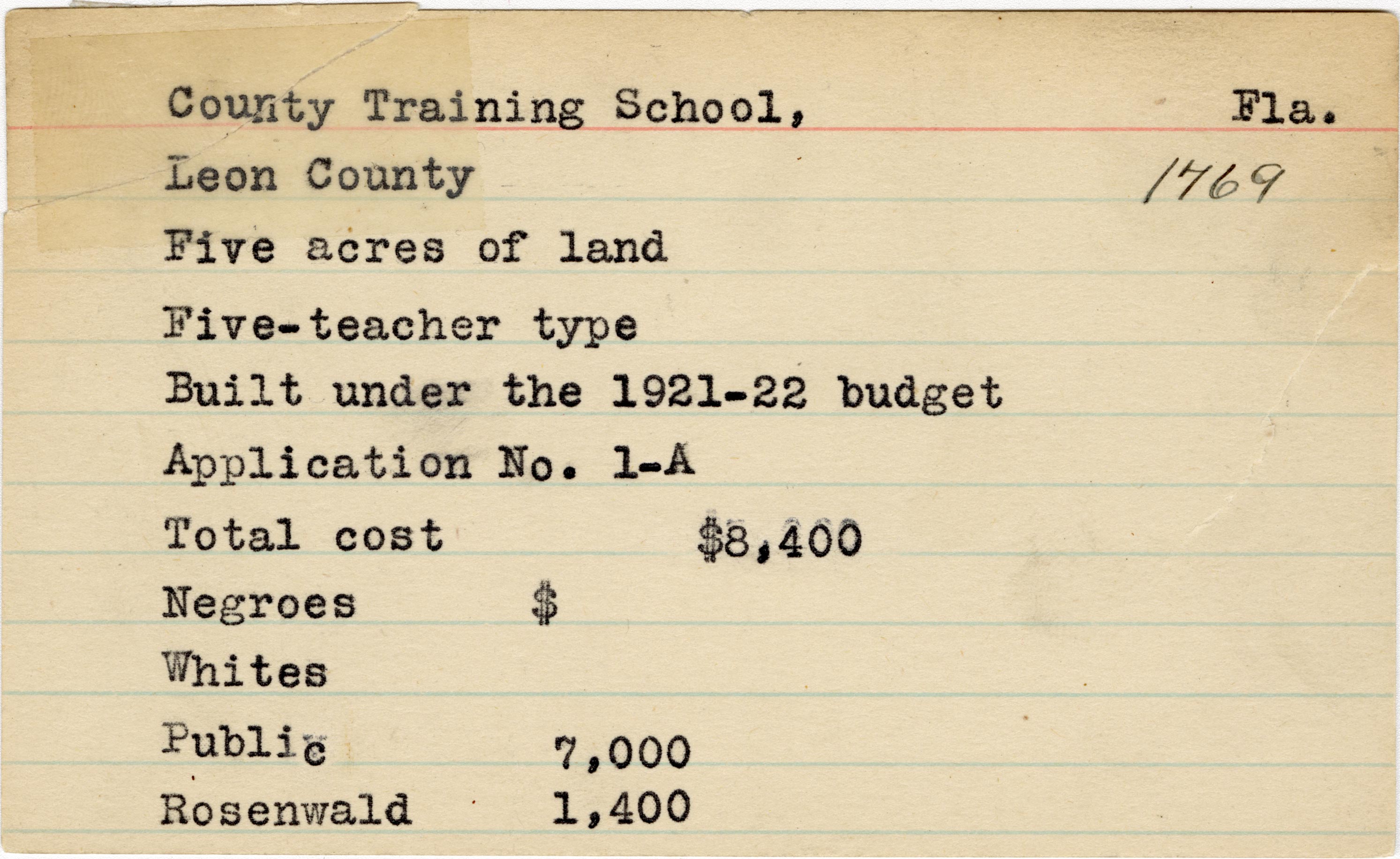 - School card from the Rosenwald Fund for County Training School in Leon County, Florida