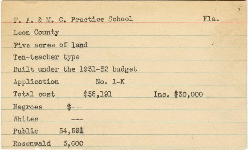 - School card from the Rosenwald Fund for F. A. & M. C. Practice School in Leon County, Florida with a section added to the budget contributions that says, "Ins. $30,000".