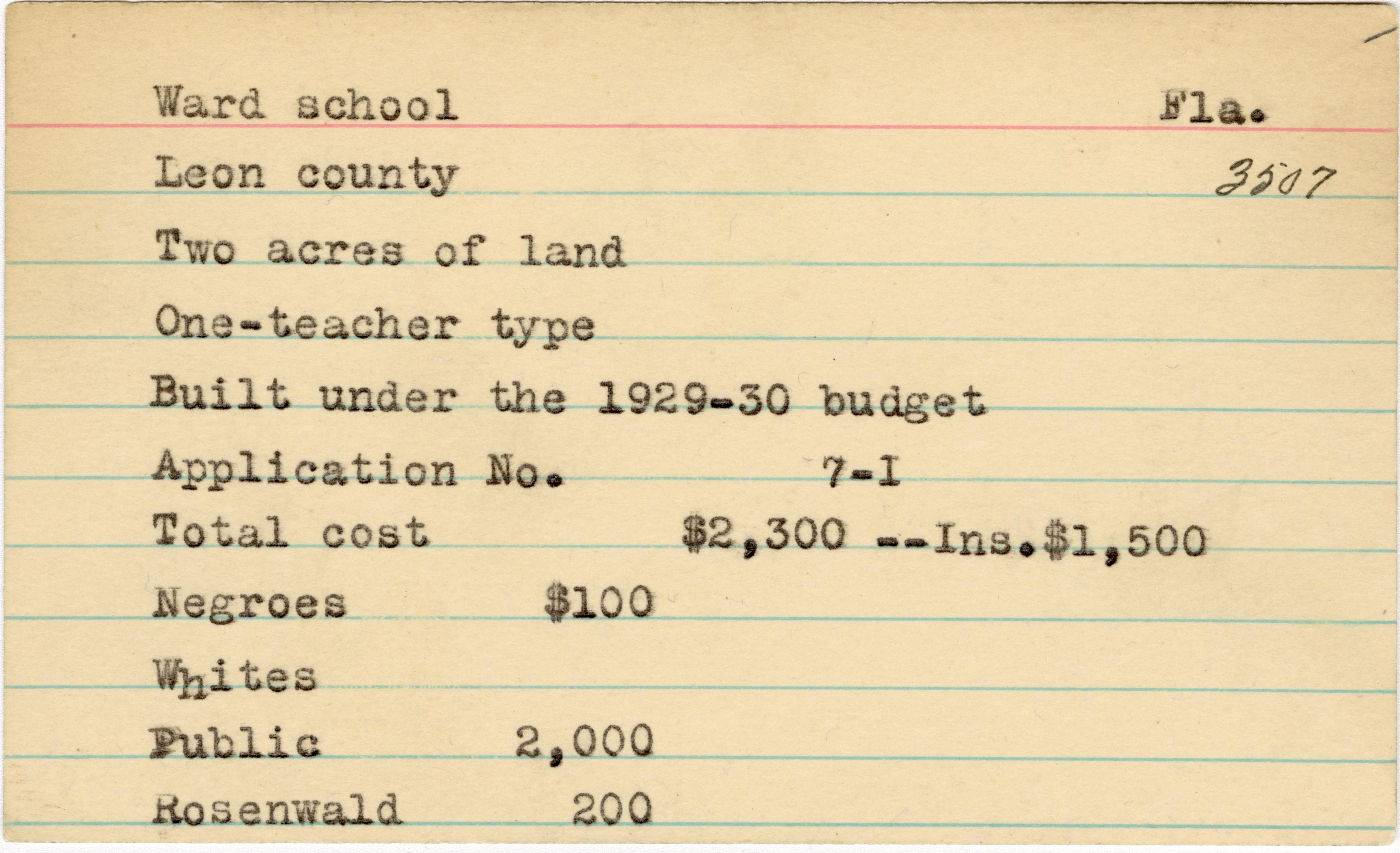 School card from the Rosenwald Fund for Ward School in Leon County, Florida with a section added to the budget contributions that says, "Ins. $1,500".