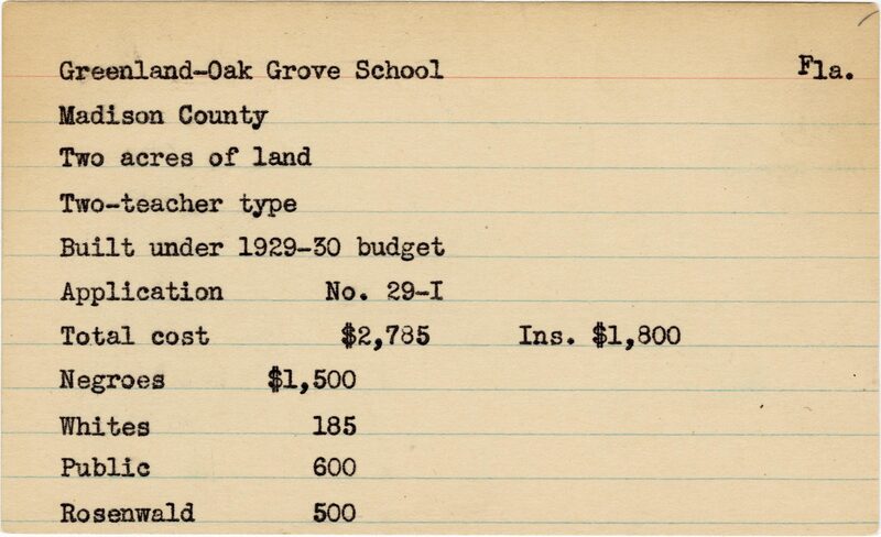 School card from the Rosenwald Fund for Greenland-Oak Grove School in Madison County, Florida with a section added to the budget contributions that says, "Ins. $1,800"